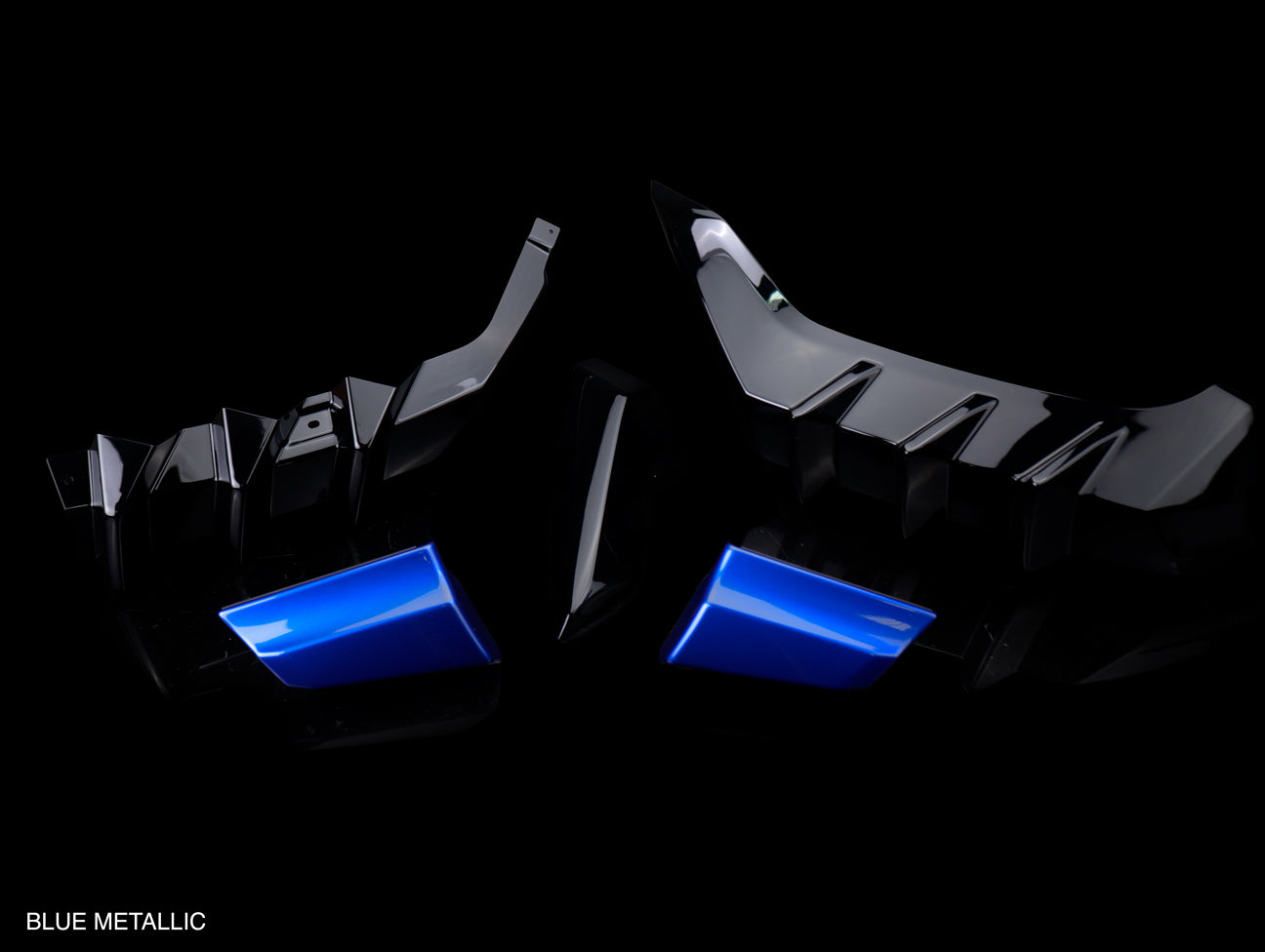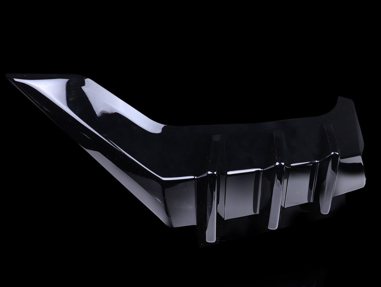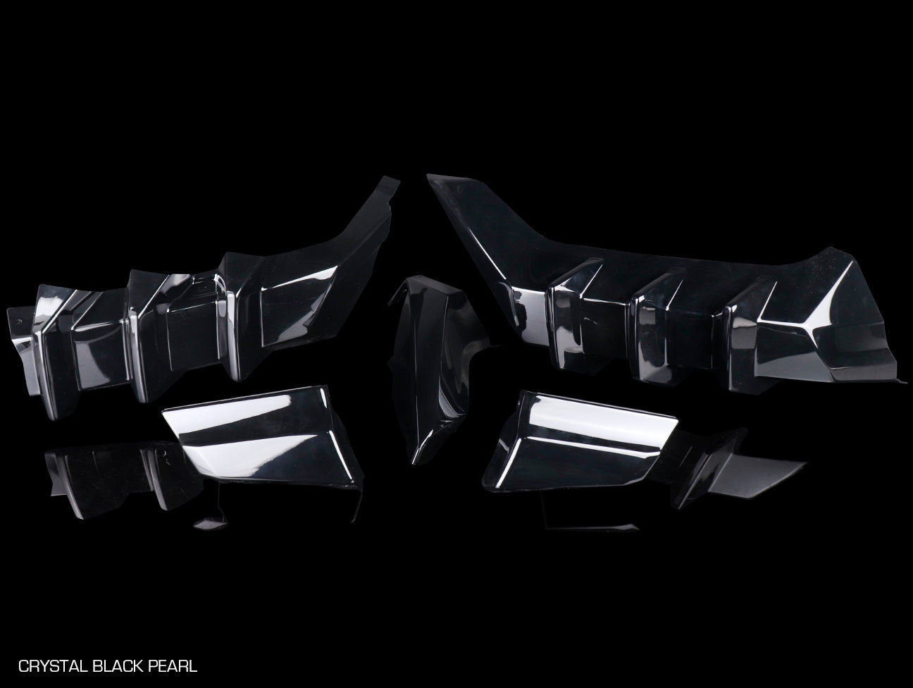 Right and left divided Mugen rear under spoiler with a diffuser-style layout. Gloss black is selected as its body color to show lightness and an aggressive style. To be installed on the standard FK8 rear bumper / Vacuum-molded PPE / Painted x glossy black This kit is made up of 2 gloss black parts and 3 car unpainted or colored parts, totally 5 separate parts.