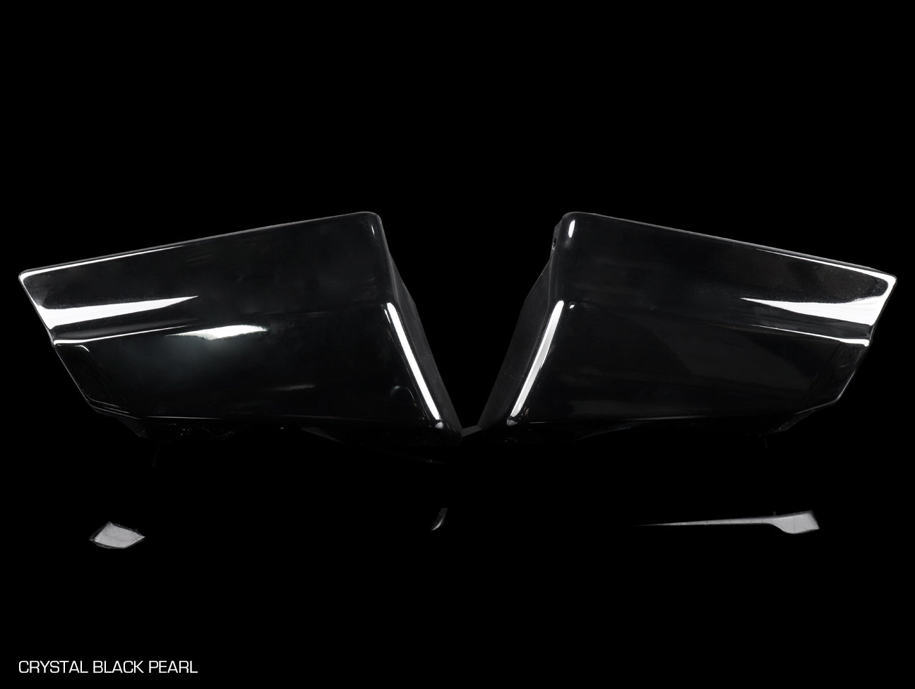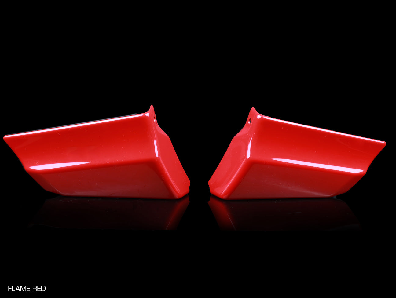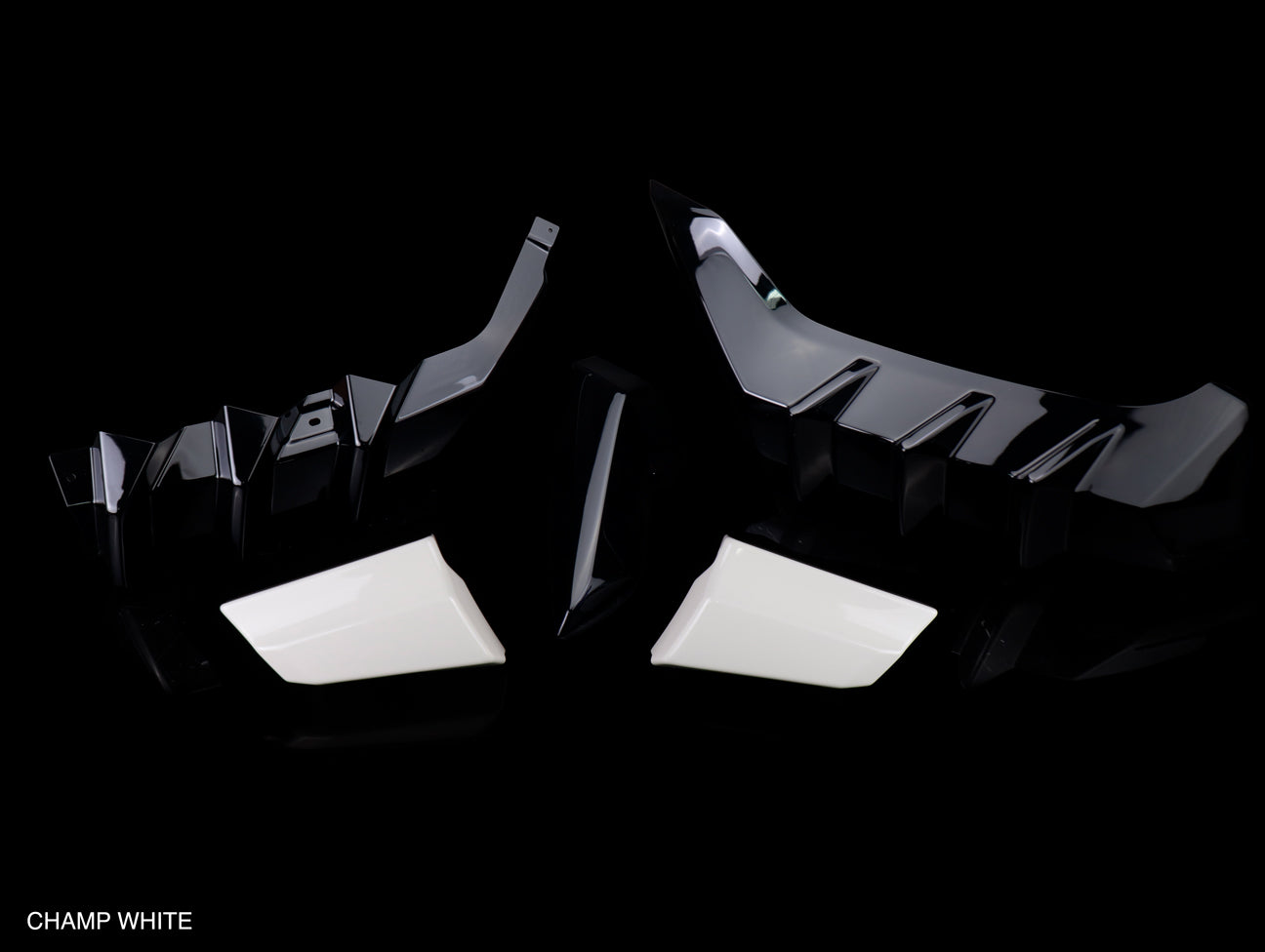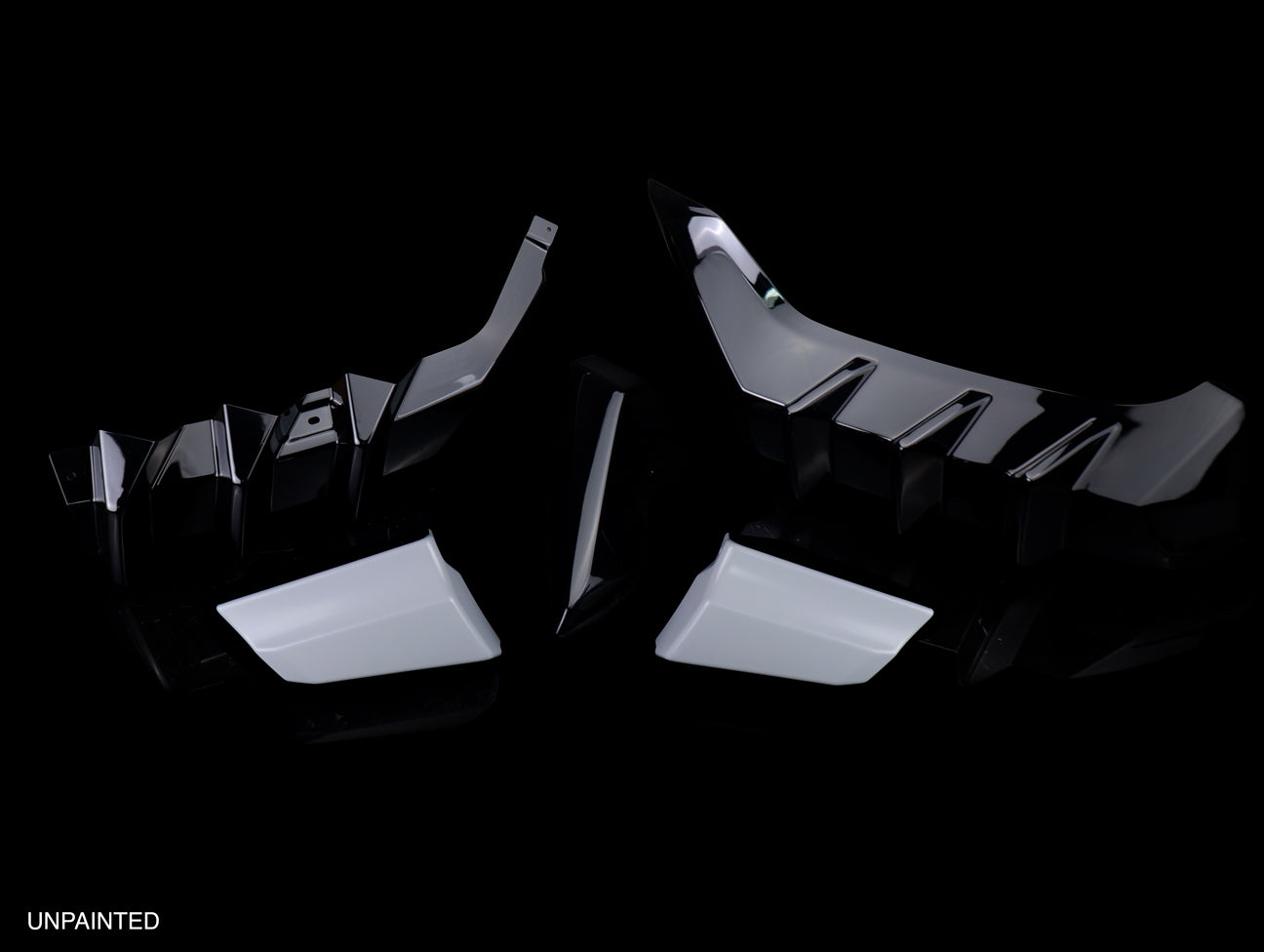 Right and left divided Mugen rear under spoiler with a diffuser-style layout. Gloss black is selected as its body color to show lightness and an aggressive style. To be installed on the standard FK8 rear bumper / Vacuum-molded PPE / Painted x glossy black This kit is made up of 2 gloss black parts and 3 car unpainted or colored parts, totally 5 separate parts.