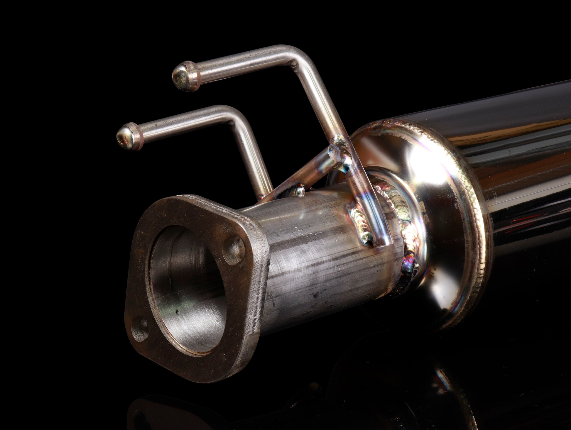 Straight through muffler design gives better flow for increased power and allows for a lighter weight system with an aggressive tone. Compact muffler canisters offer optimal ground clearance for lowered vehicles.
