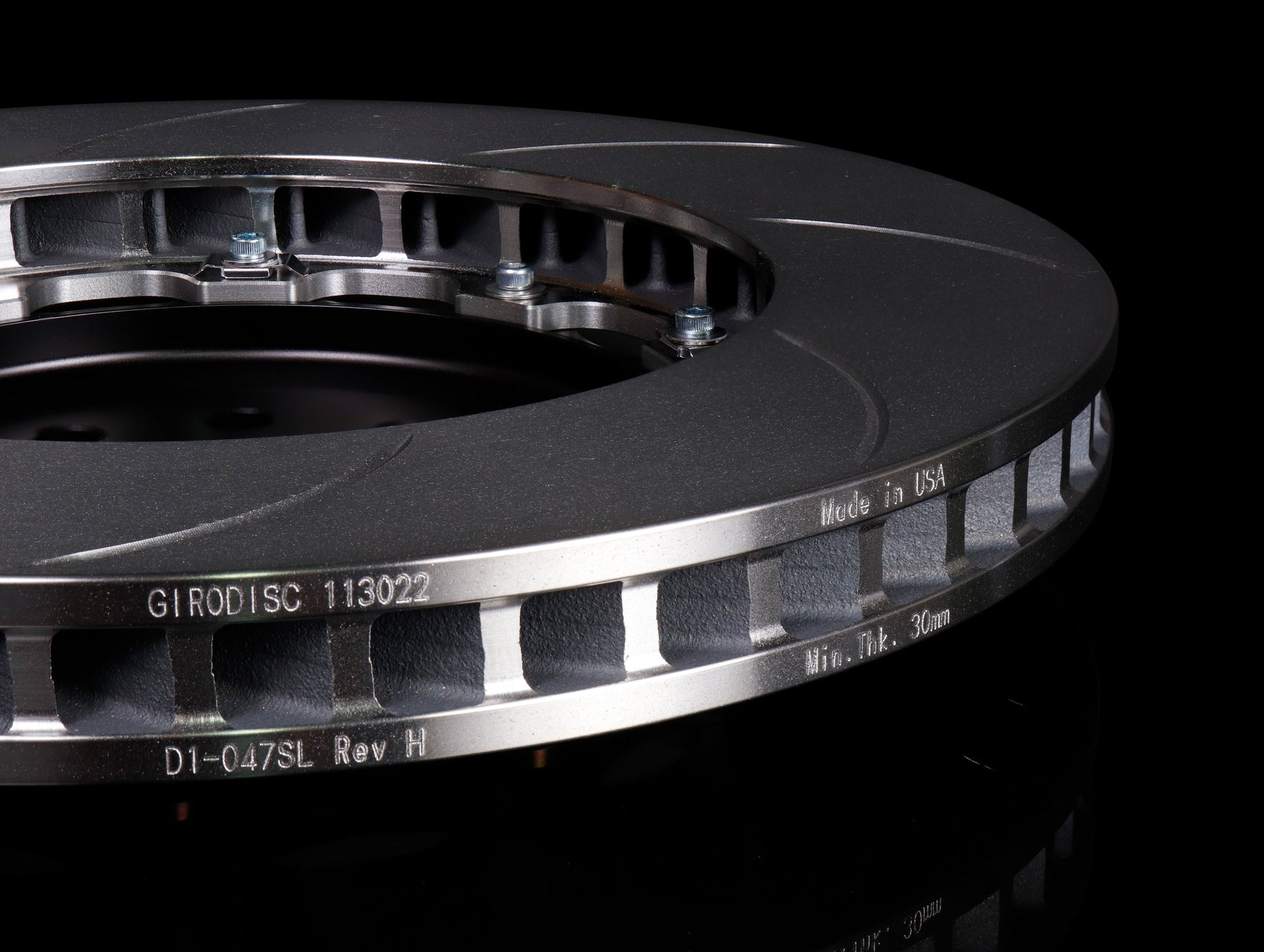 The central hat section of our rotor is made from strictly U.S. sourced 6061-T6 aircraft specification aluminum. The disc is made from our own proprietary cast iron, poured in the USA and machined from start to finish in house at Girodisc. The rotor utilizes a curved vane design, developed in racing to act as a centrifugal pump to force cooling air through the disc.