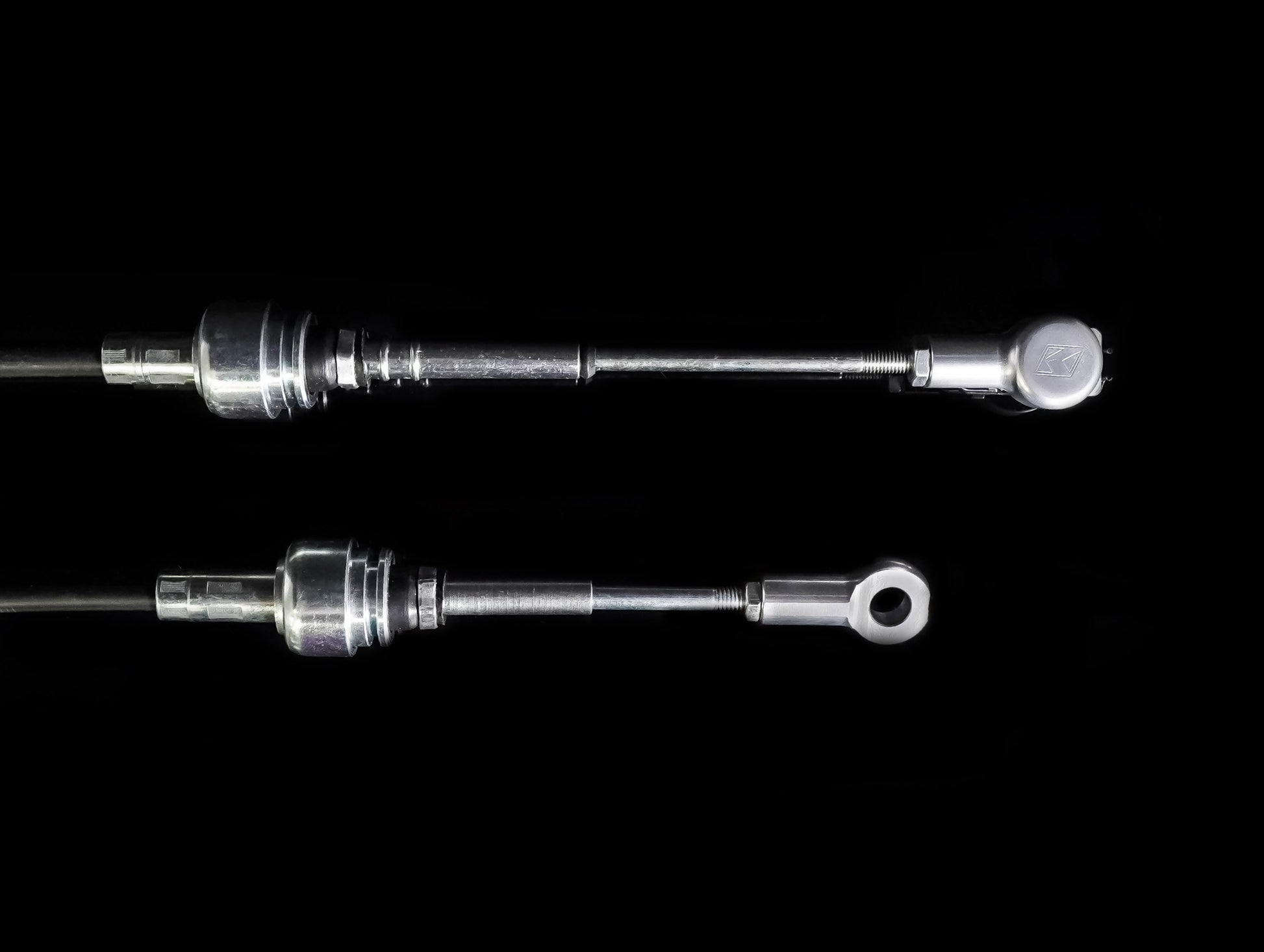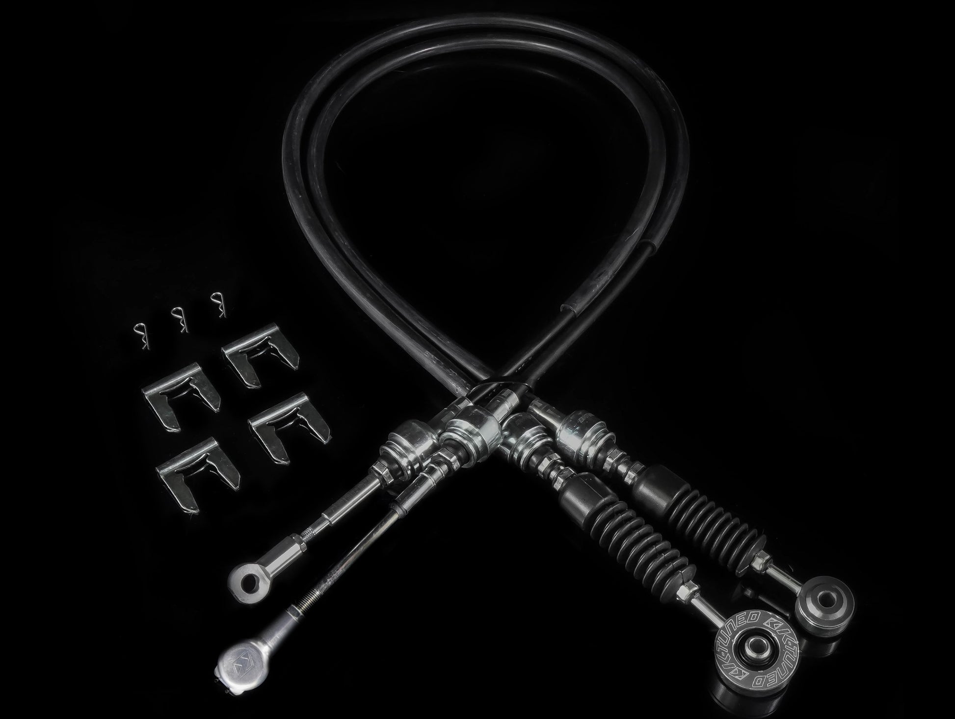 These OEM-Spec Shifter Cables are made entirely of high quality materials and they were designed to meet or exceed the OEM units in all areas of construction. The transmission side of the cables features our new spherical bushing which allows greater movement while still providing a strong positive cable. The unique design of these bushings allow the cables to pivot freely while providing a strong and tight feel. These bushings improve shift feel and accuracy when compared to the factory rubber bushings. At the transmission custom billet cable ends are used to provide a strong replacement over the OEM plastic unit. K-Tuned's cable set is sold complete with all hardware for installation. This includes 3 reusable hairpin style cotter pins for all cable end connections, and 4 cable retaining clips. K-Tuned's OEM-Spec Shifter Cables are priced right, made to last and work flawlessly.