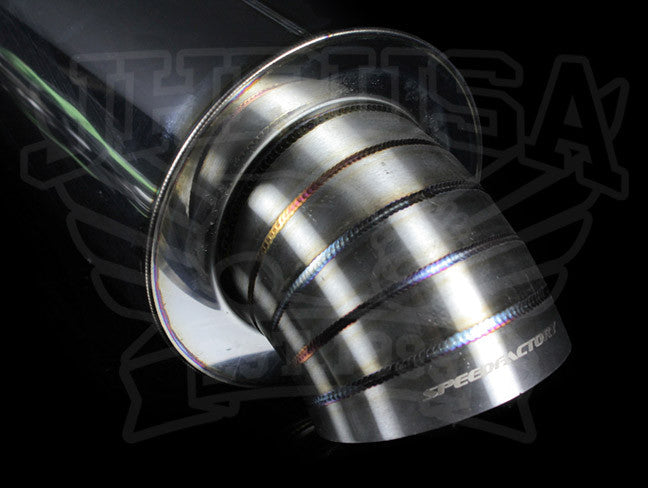 Construction consists of high quality polished T304 stainless steel with a beautifully TIG welded & back purged body and exhaust tip. Premium multi-layer high temp packing ensures long lasting performance and a 6.0” diameter round body offers good sound suppression & fitment flexibility. The SpeedFactory logo is laser engraved onto the tip.