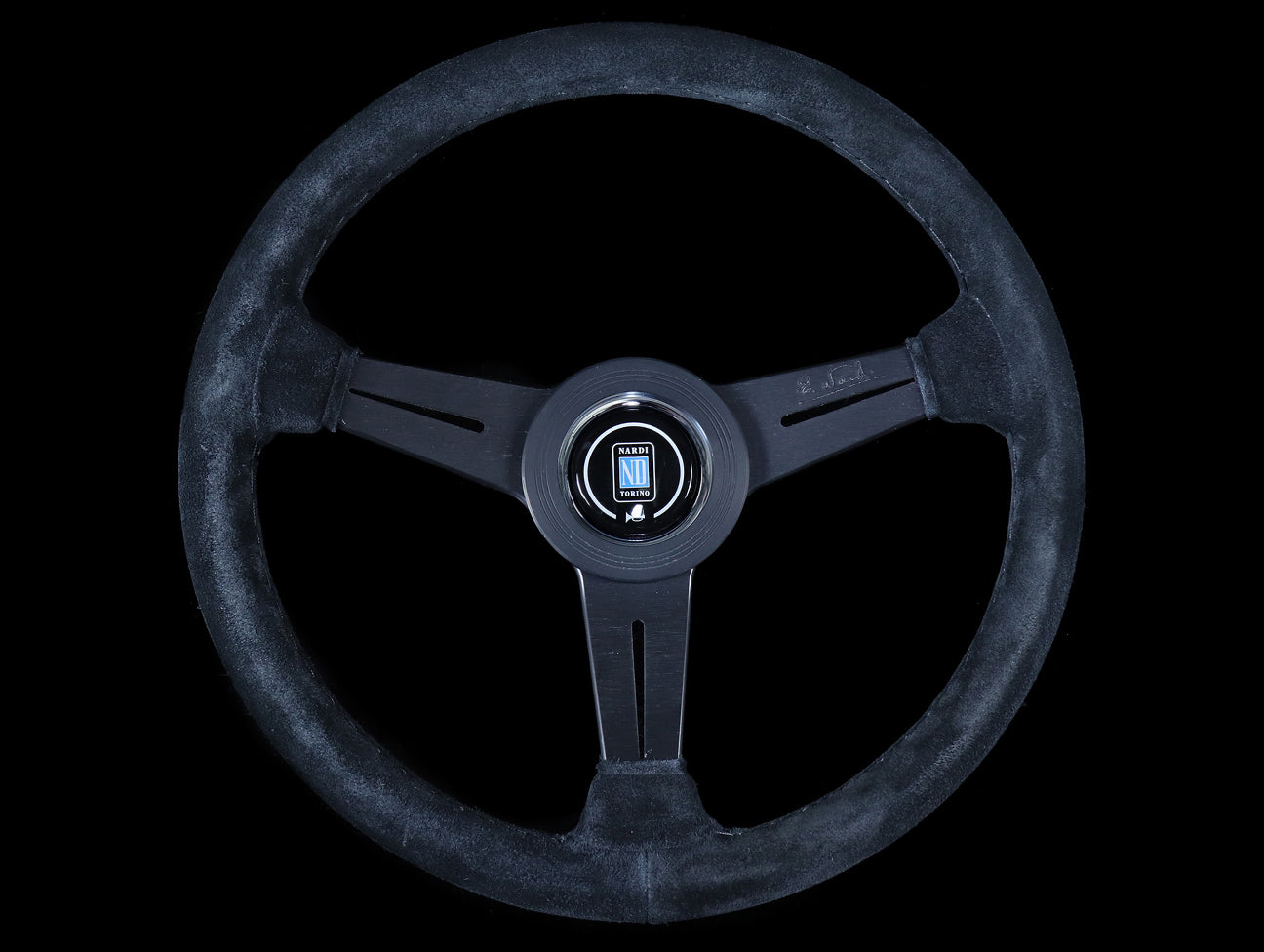 This Nardi Classic steering wheel has a black suede hand grip, black stitching, anodized black spokes, matching black center ring, mounting hardware, and Nardi horn button.
