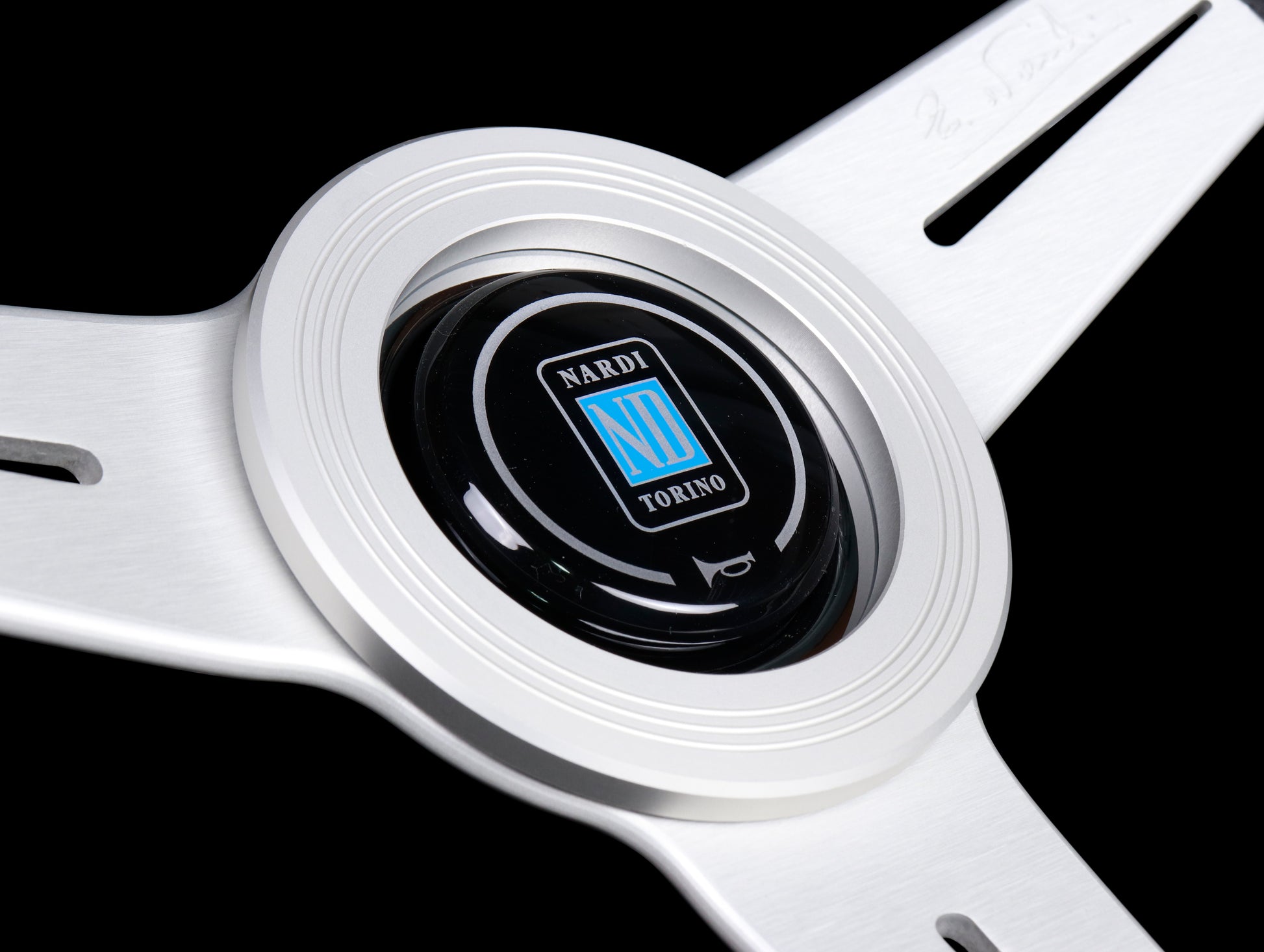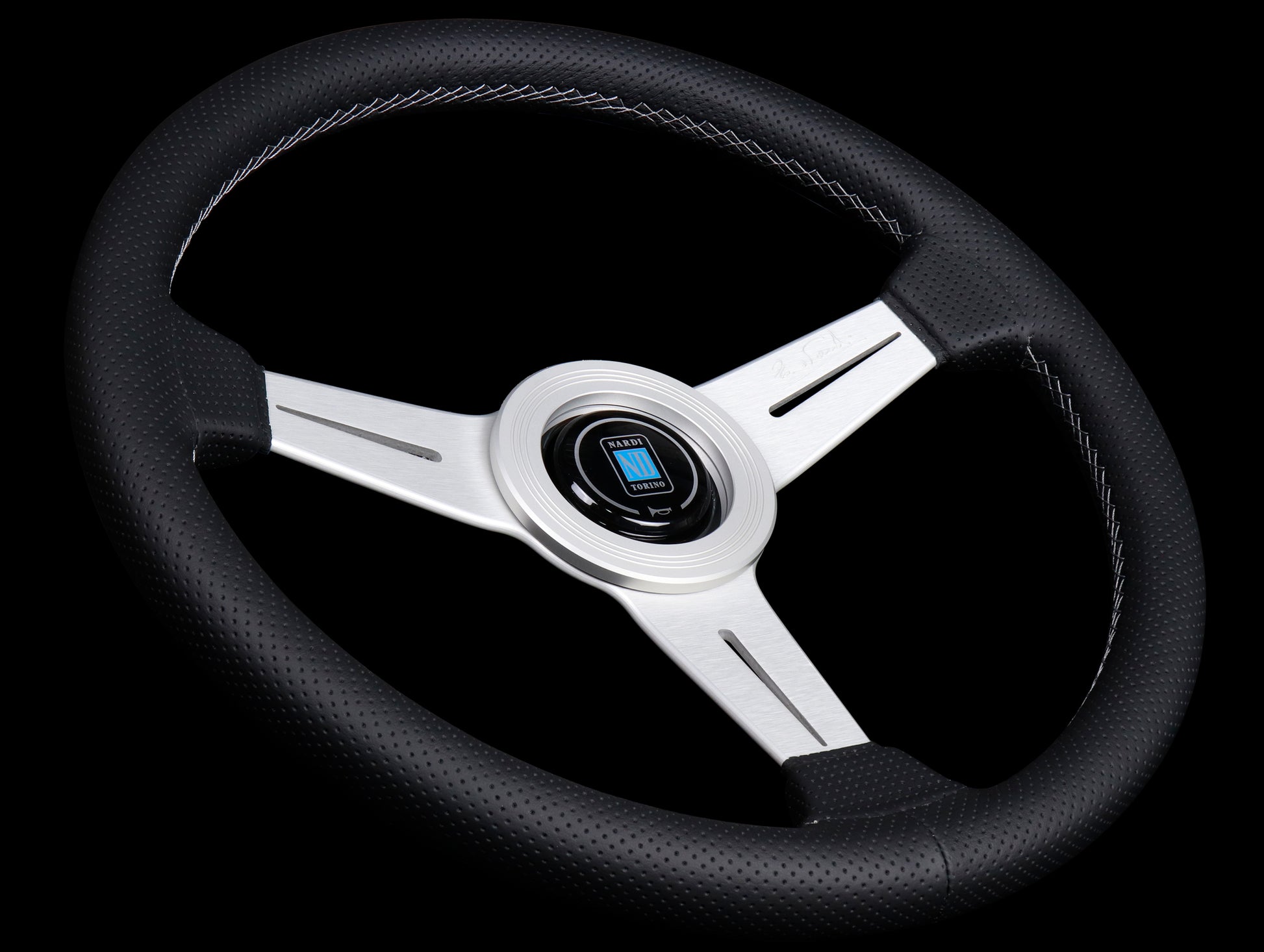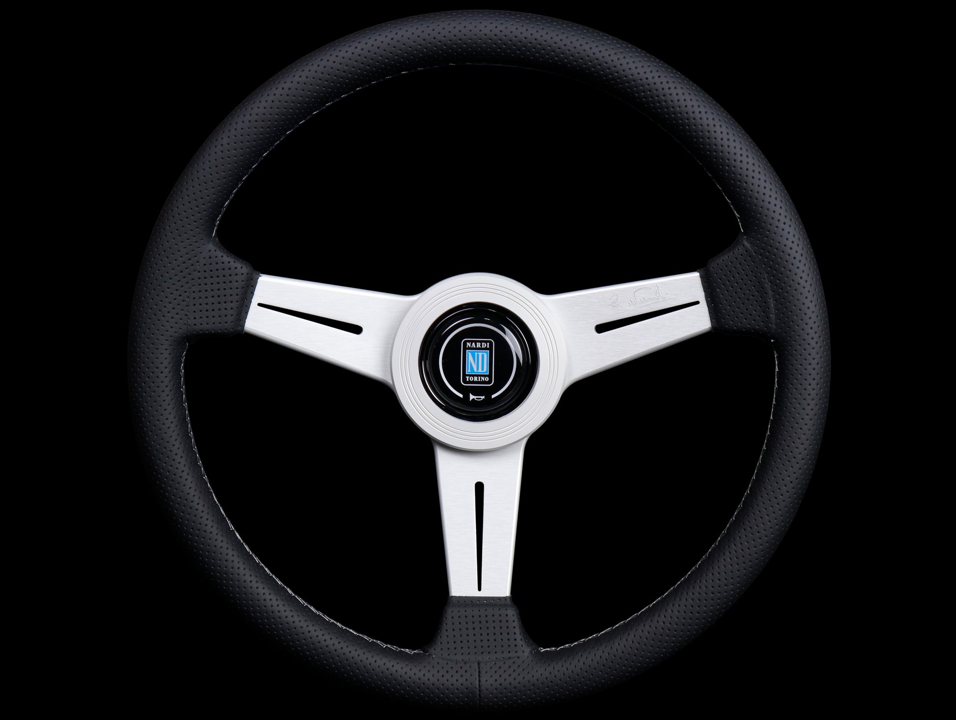 This Nardi Classic steering wheel has a black perforated leather hand grip, grey stitching, matte silver anodized spokes, matching silver center ring, hardware, and classic Nardi horn button.