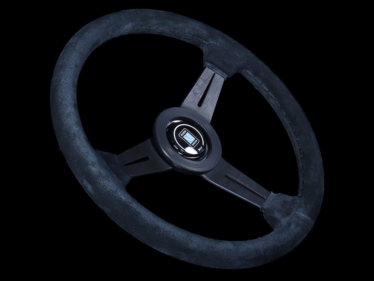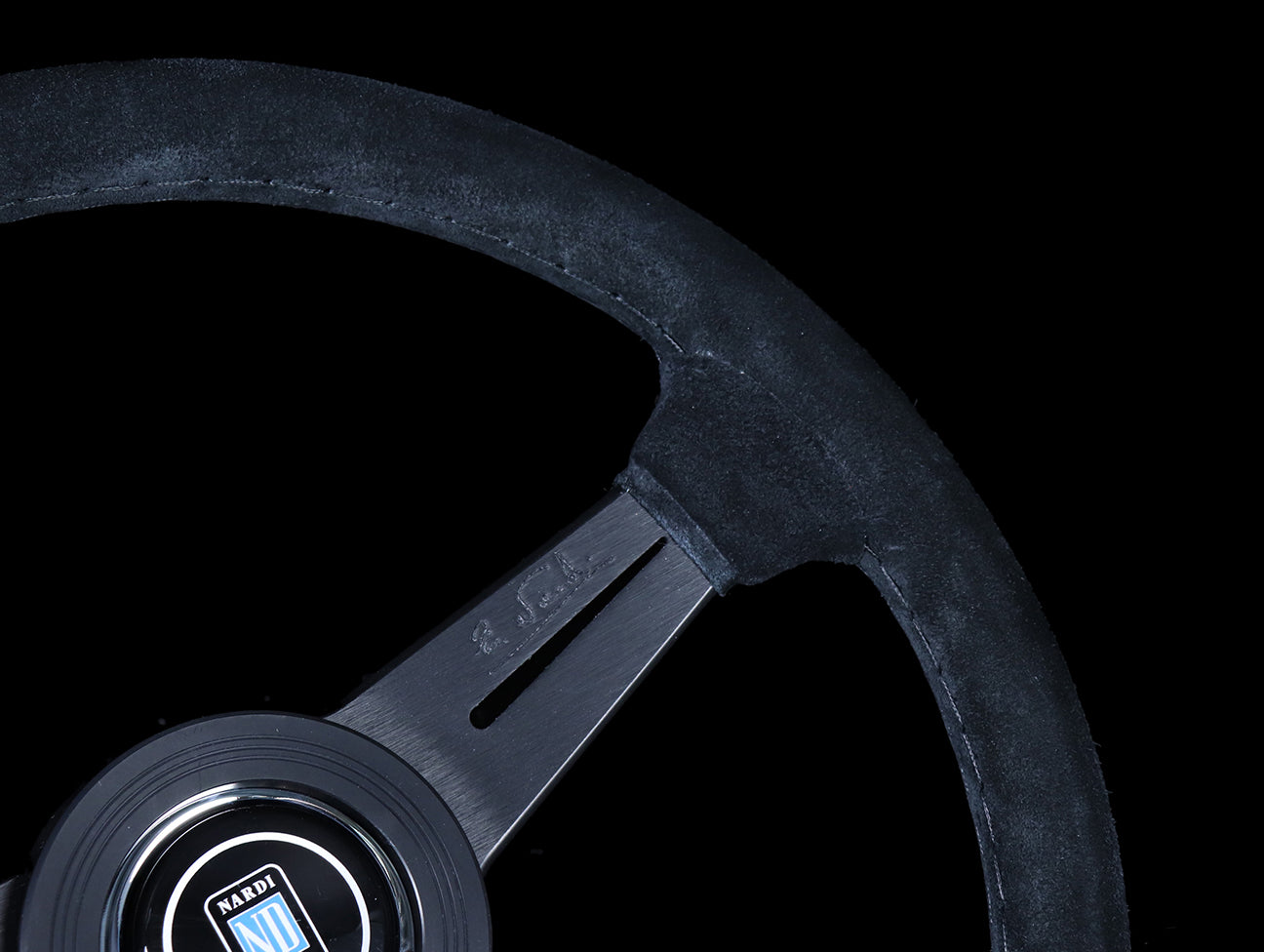 This Nardi Classic steering wheel has a black suede hand grip, black stitching, anodized black spokes, matching black center ring, hardware, and classic Nardi horn button.