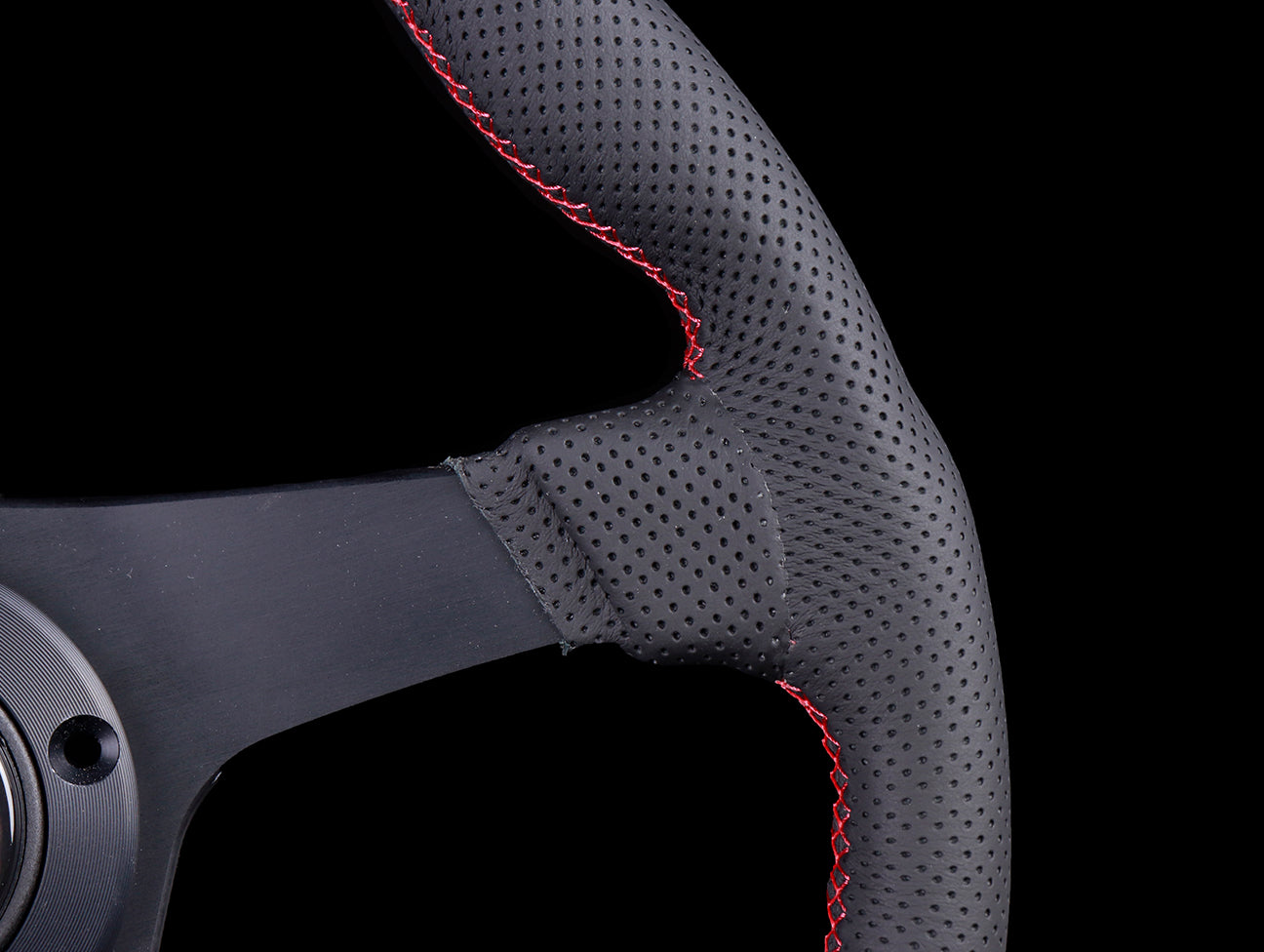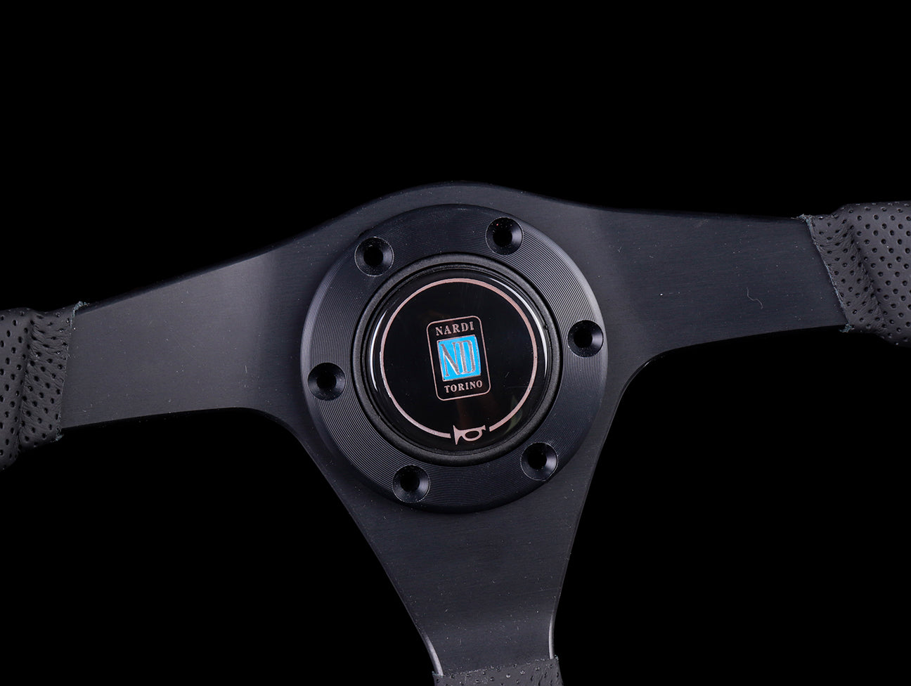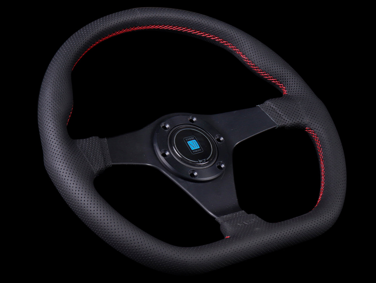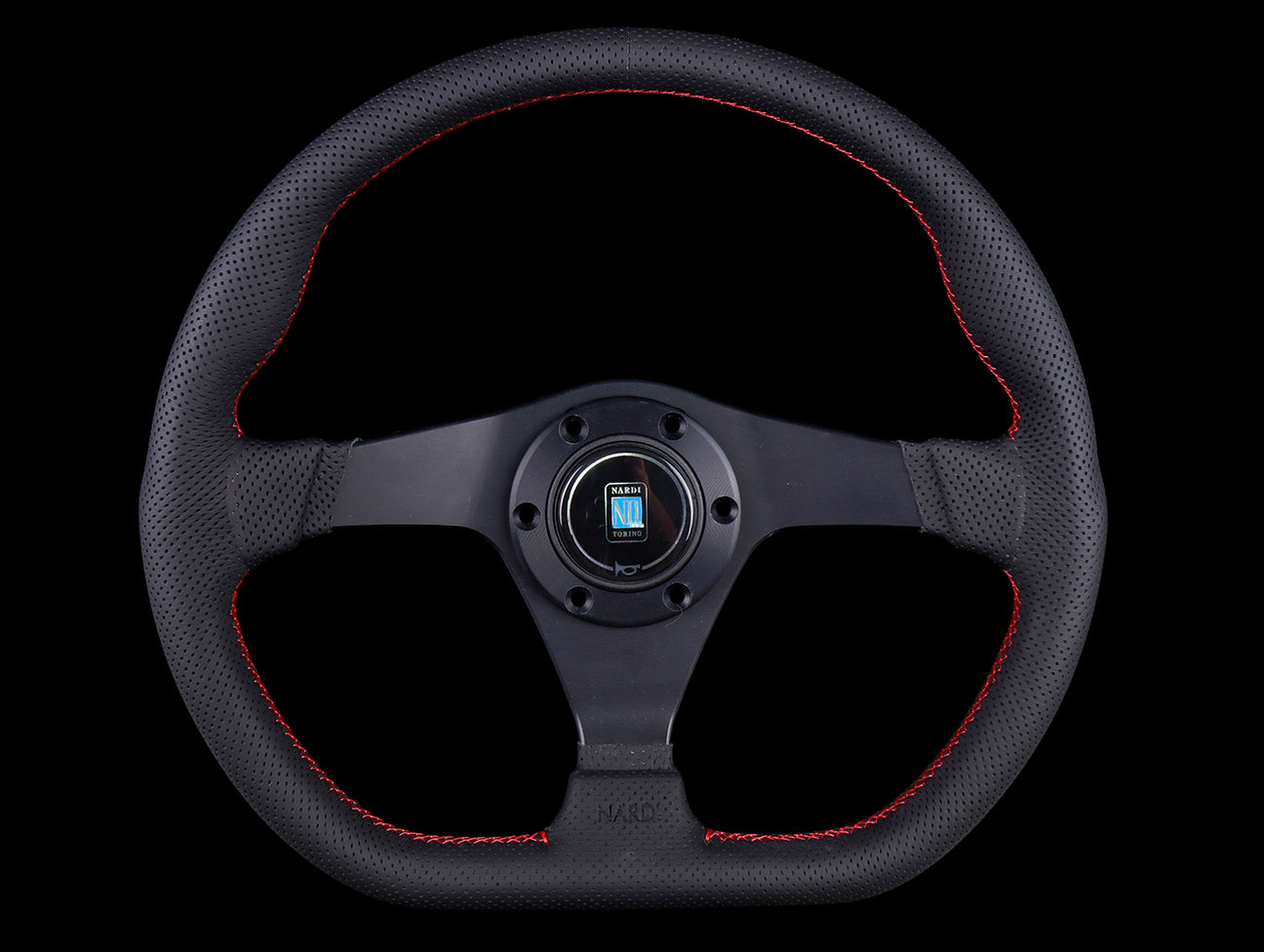 The Nardi Gara Sport steering wheel features a flat bottom for better knee/leg clearances, has a black perforated leather hand grips, red cross stitching, anodized black spokes, matching black center ring, Nardi horn button and countersink Allen screws (6pc).