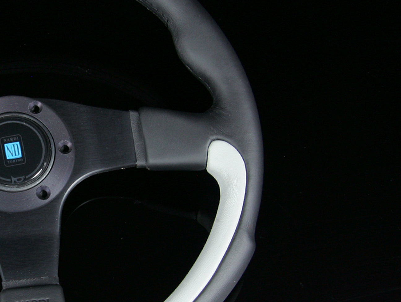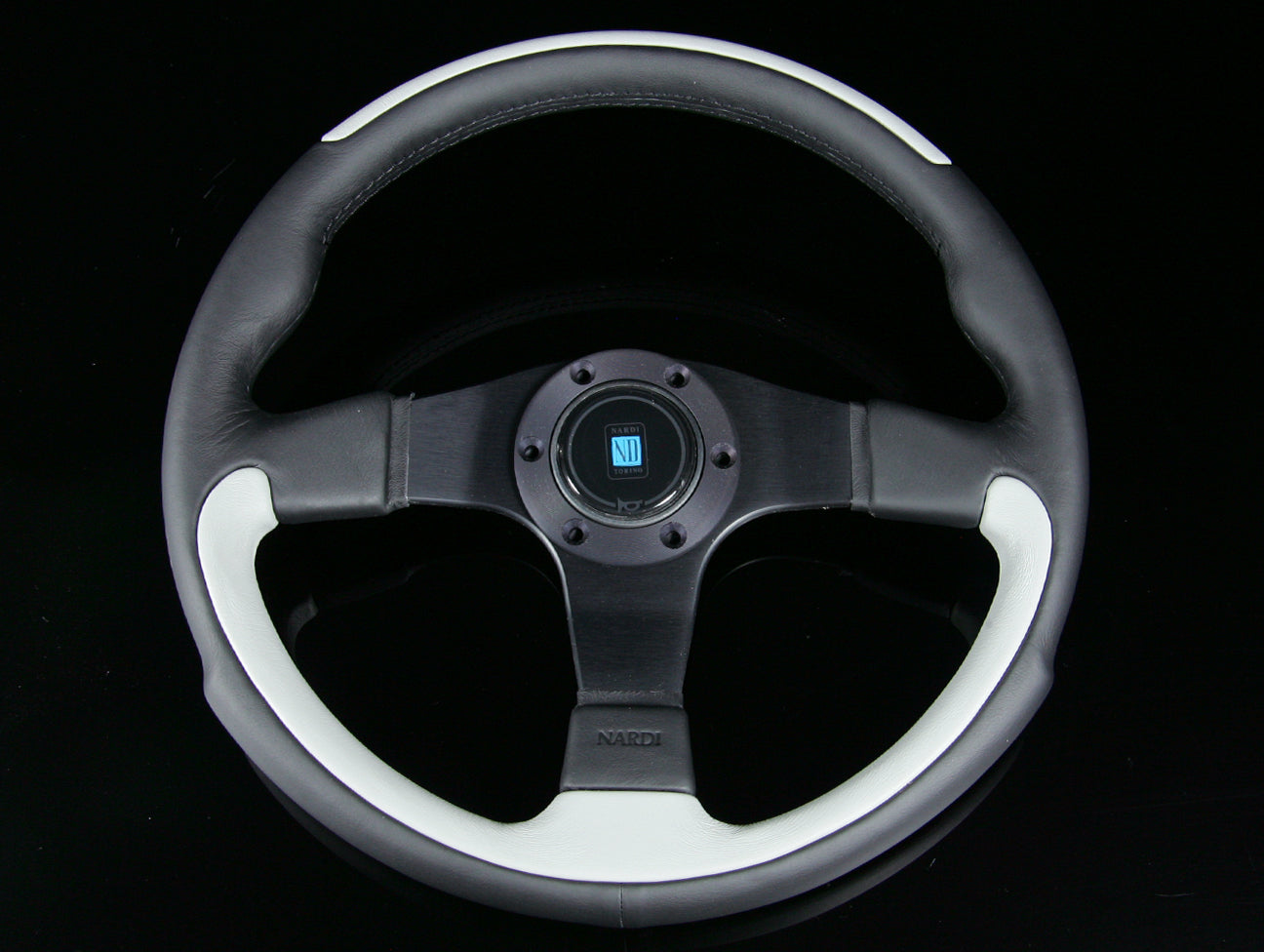 This Nardi Leader steering wheel has a black and grey leather hand grip, anodized black spokes, matching black center ring, and Nardi horn button.