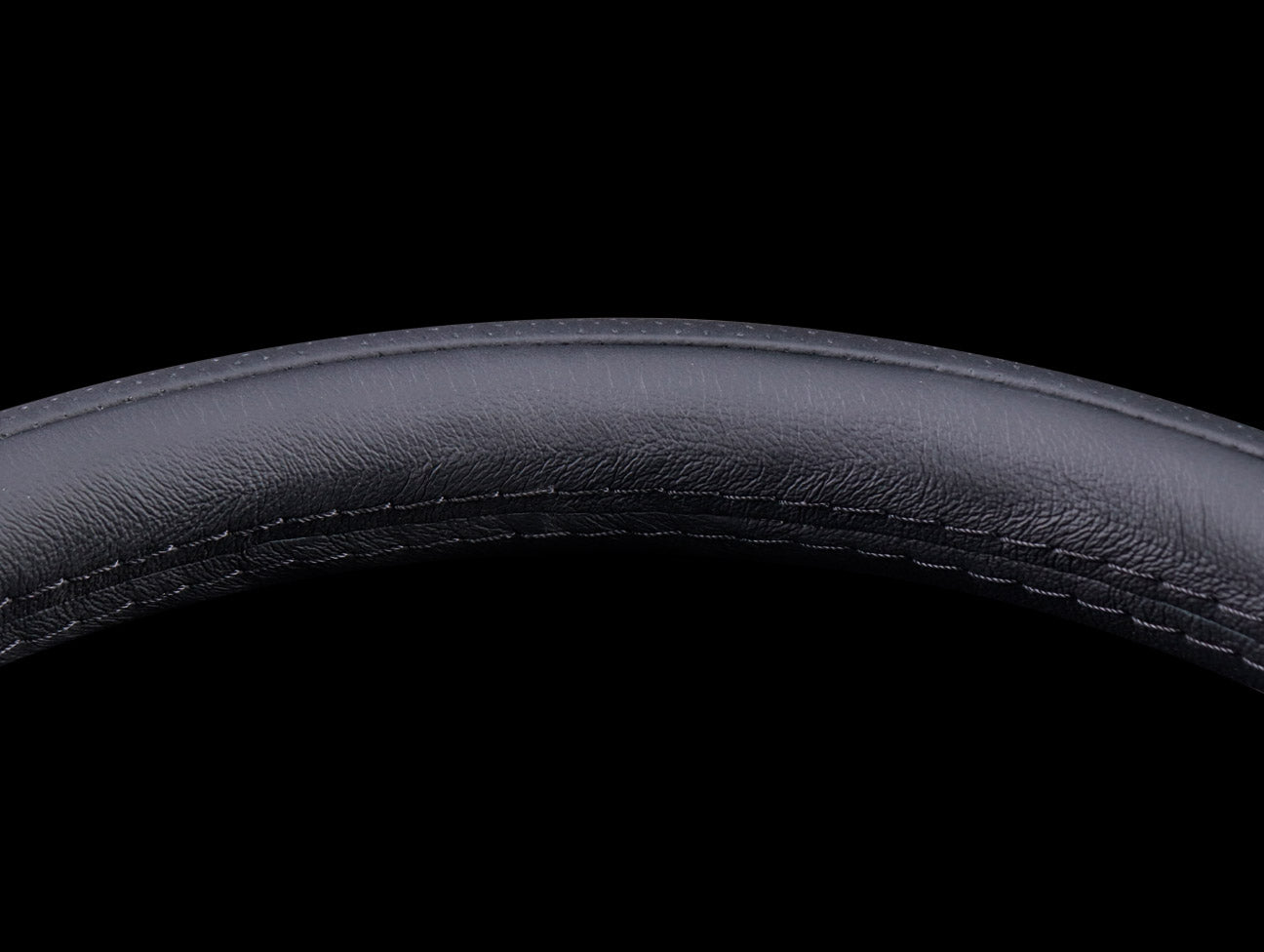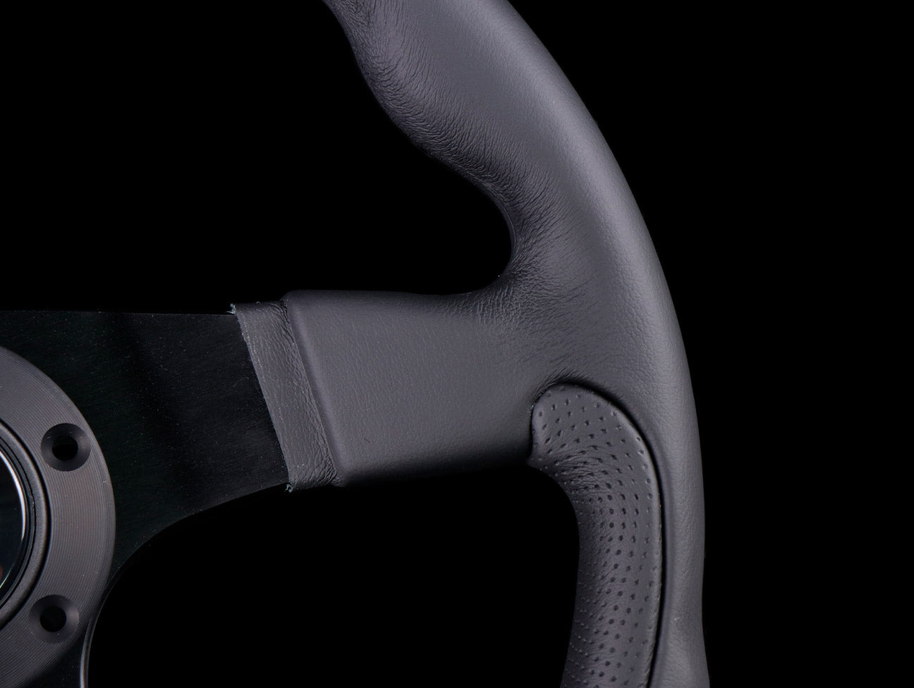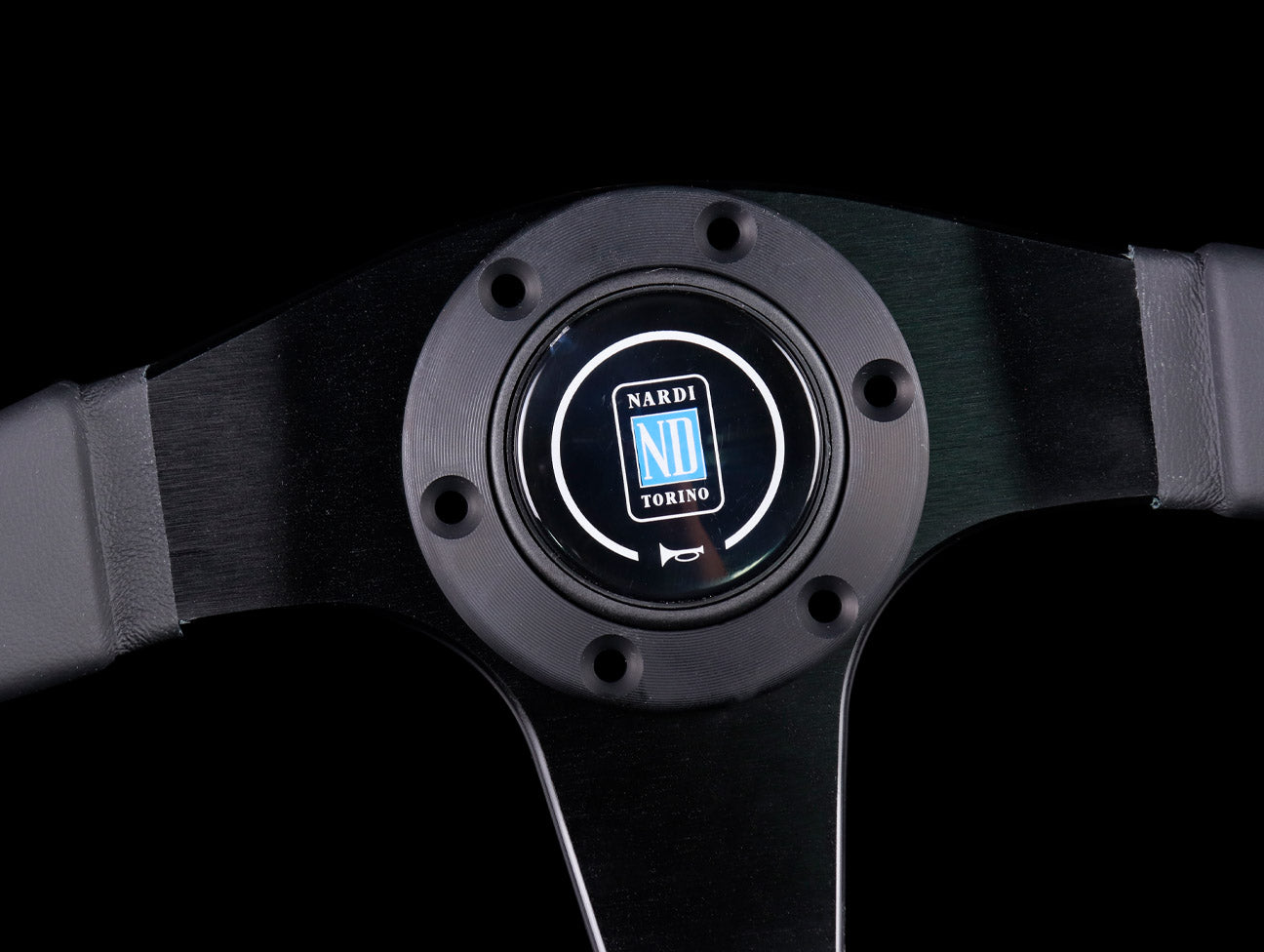 This Nardi Leader steering wheel has a black smooth leather hand grip, anodized black spokes, black dual stitching, matching black center ring, and Nardi horn button with hardware.