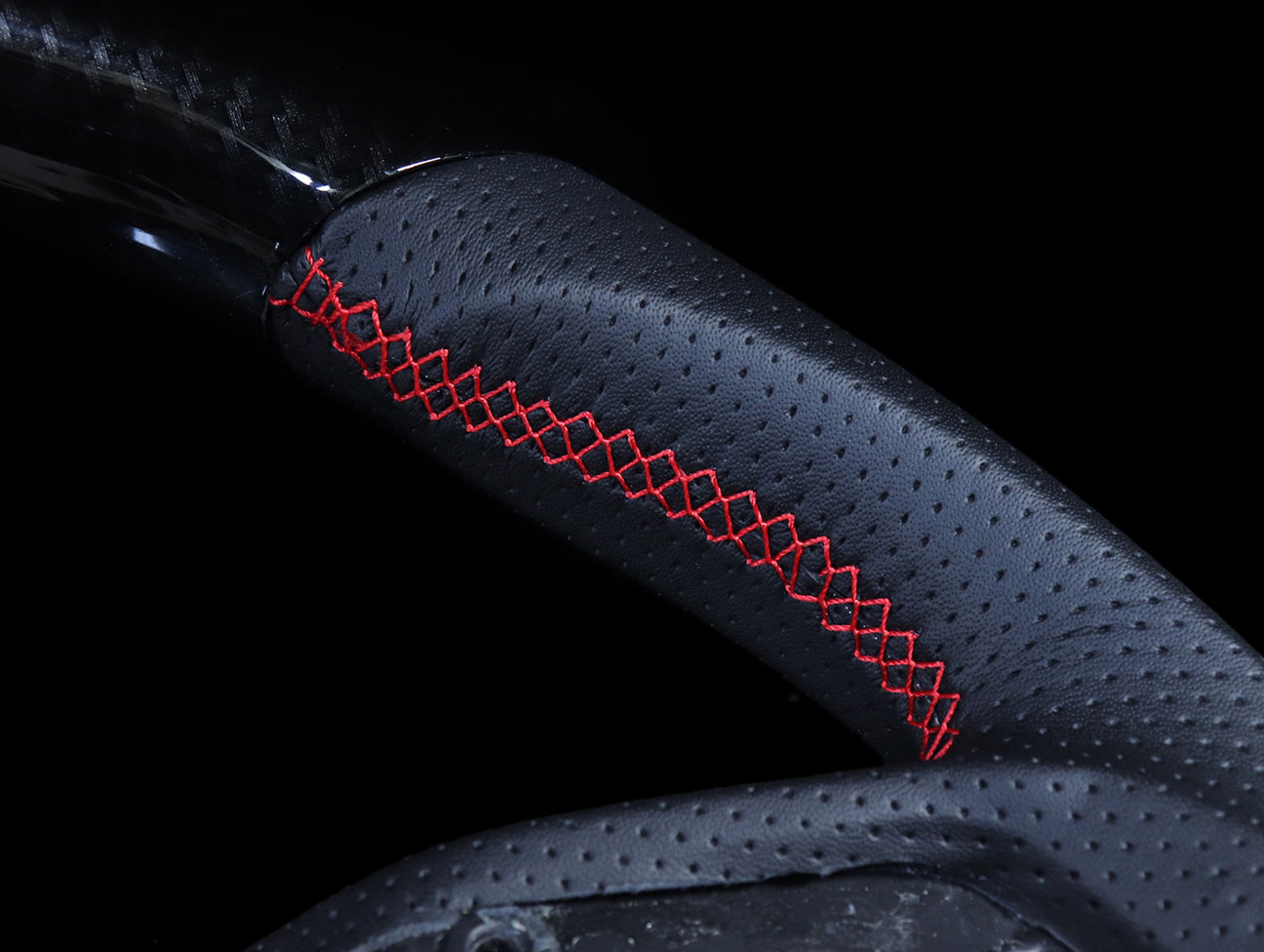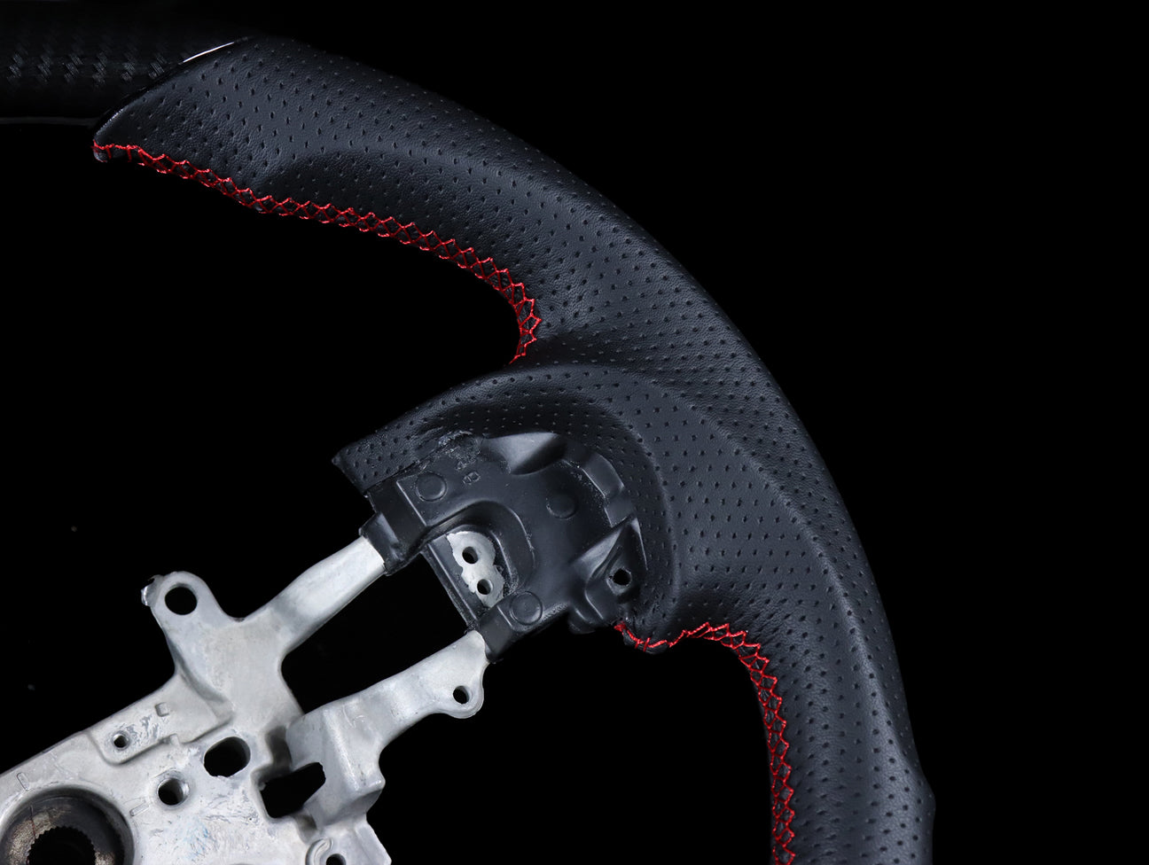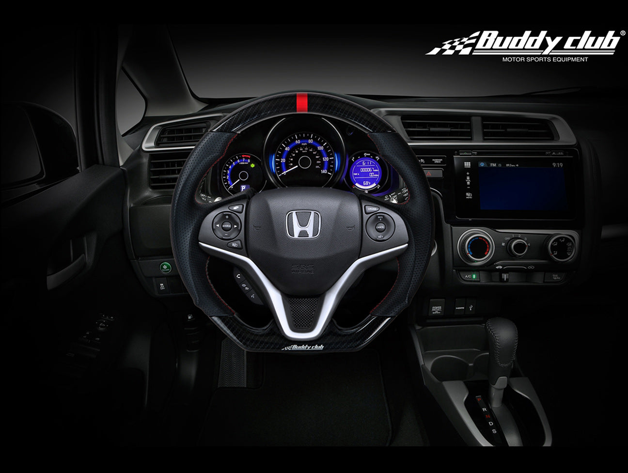 This new Buddy Club Sport steering wheel offers a sportier look and feel compared to the stock unit and is a direct replacement of the factory 2015-18 Fit wheel. It features a carbon fiber and perforated leather wrapped hand grips w/red cross hatch stitching.