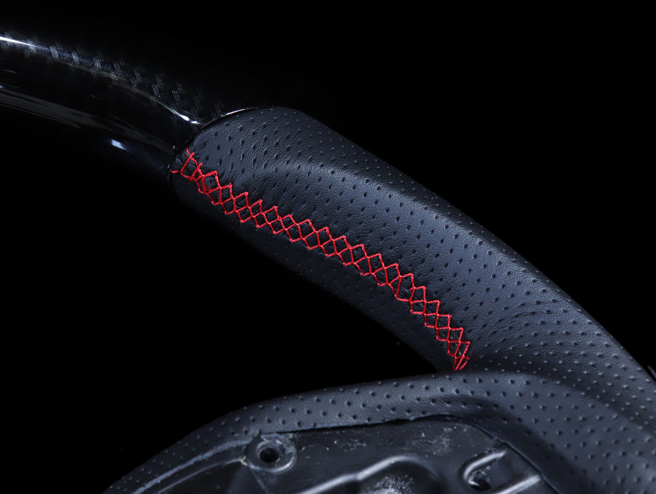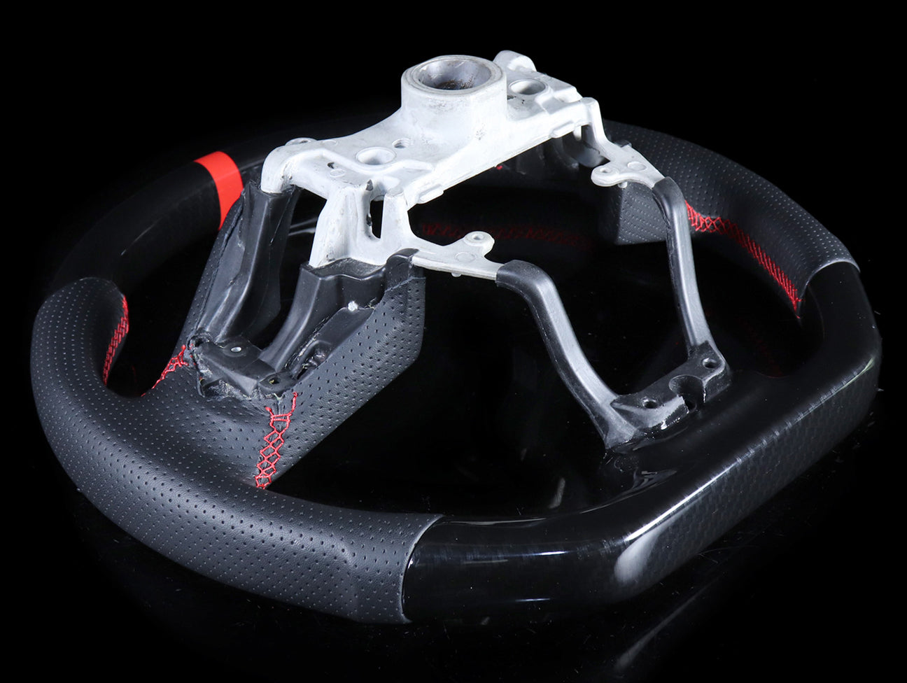 This new Buddy Club Sport steering wheel offers a sportier look and feel compared to the stock unit and is a direct replacement of the factory 16-21 Civic & Civic Type-R wheel. It features a carbon fiber and perforated leather wrapped hand grips w/red cross hatch stitching.