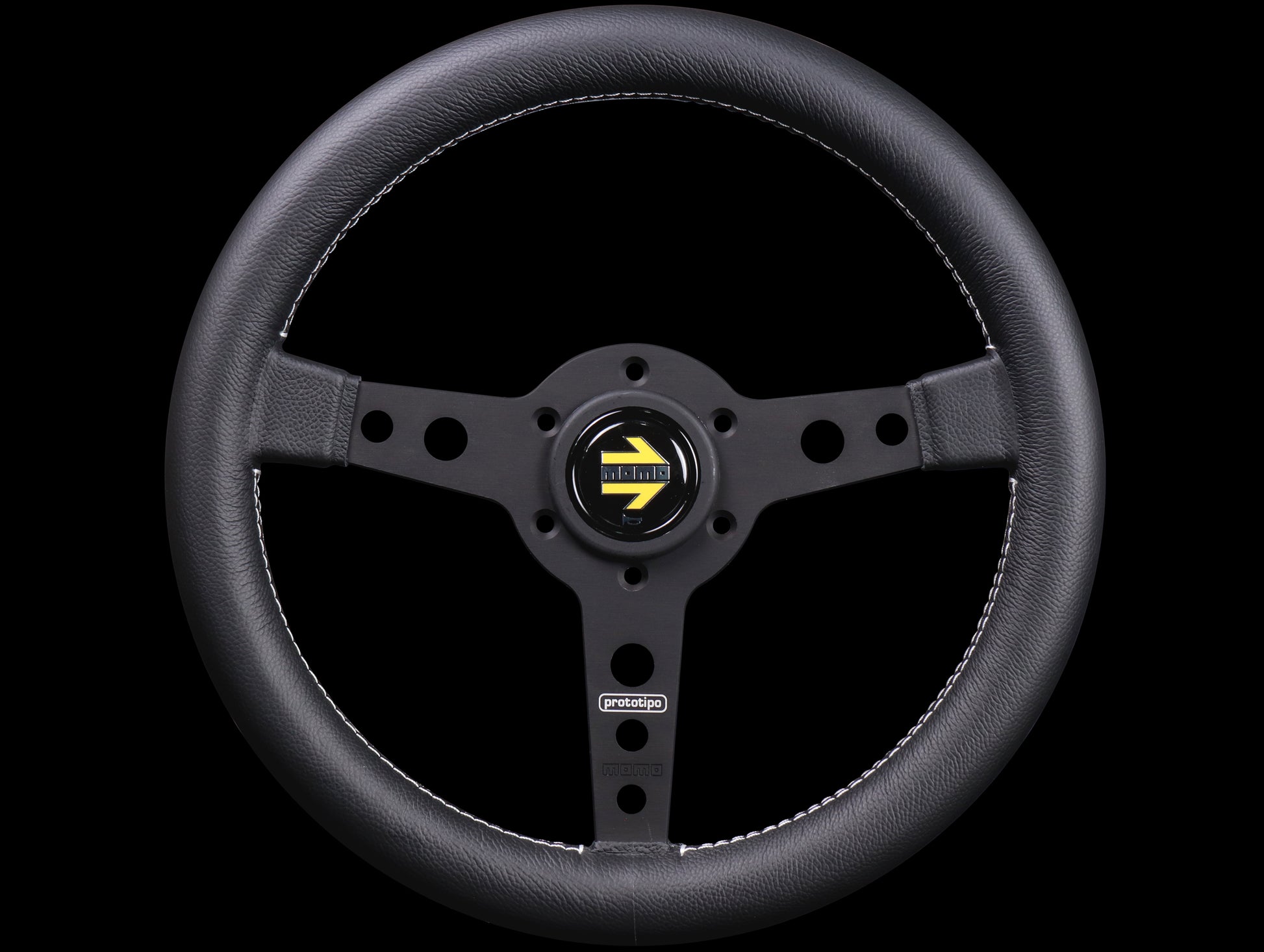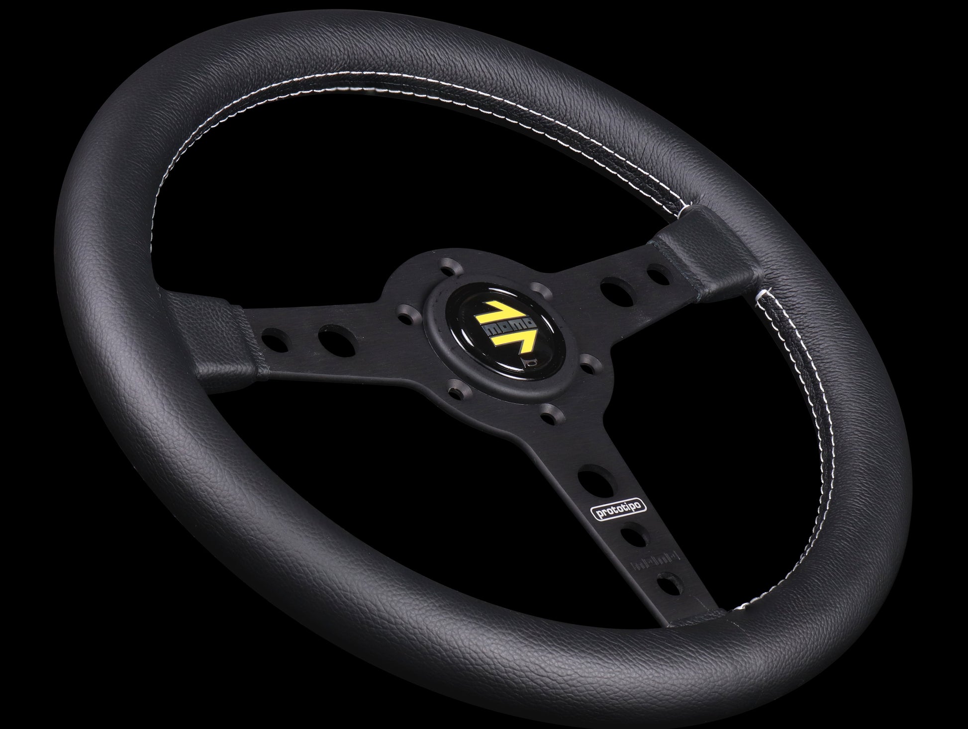 The Momo Prototipo steering wheel is a popular period wheel the factory used on many of the 70's race cars. It measures 12.6" in diameter (320mm) and is wrapped in black leather grips, anodized black spokes, with white colored stitching and authentic Momo horn button.