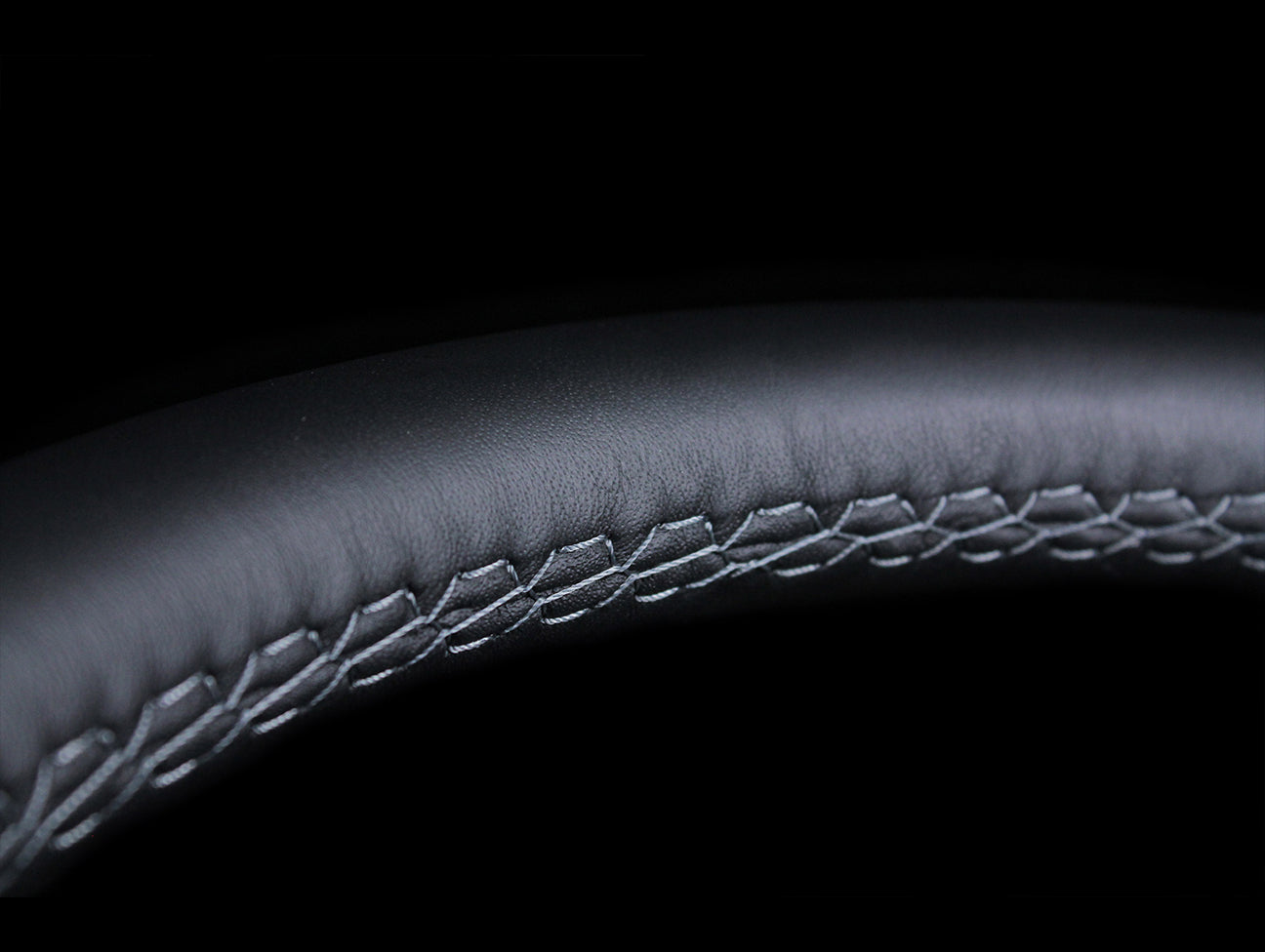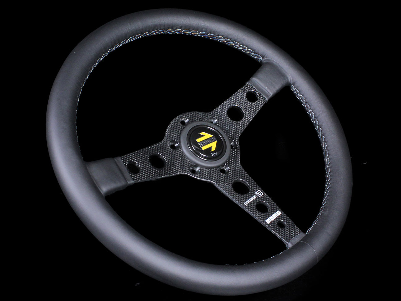 Wheel measures 13.75"/350mm diameter, grip diameter is 30x29mm, and dish pitch is 39mm. Wrapped in black leather grips with grey colored stitching and of course includes an authentic Momo horn button. Includes white felt steering wheel cover/bag.