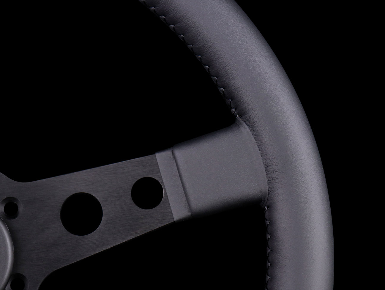 The newest version of the iconic MOMO Prototipo steering wheel goes stealth. Featuring a premium black leather grip and black spokes, the Prototipo Black Edition adds black cross stitching, a gloss black Prototipo logo, and a gloss black MOMO logo. The horn button is all new with a matte black face and gloss black MOMO arrow logo. The Prototipo Black Edition comes in a new all black box to complete the stealth appearance.