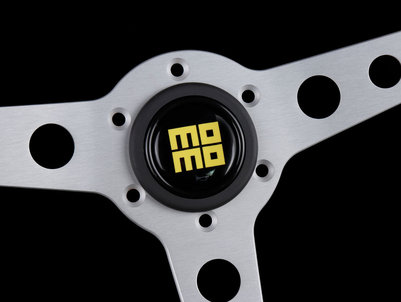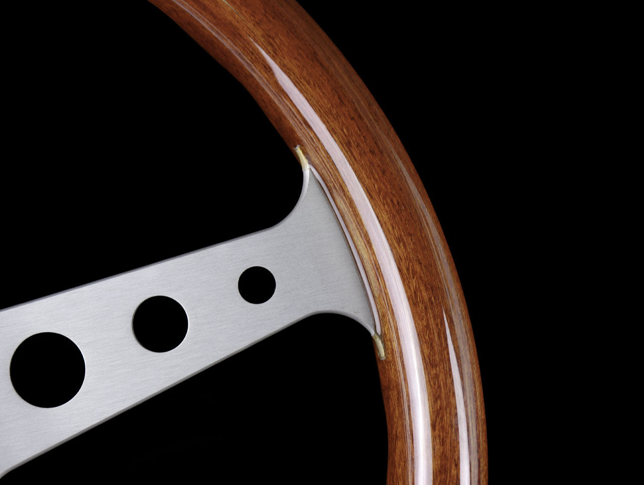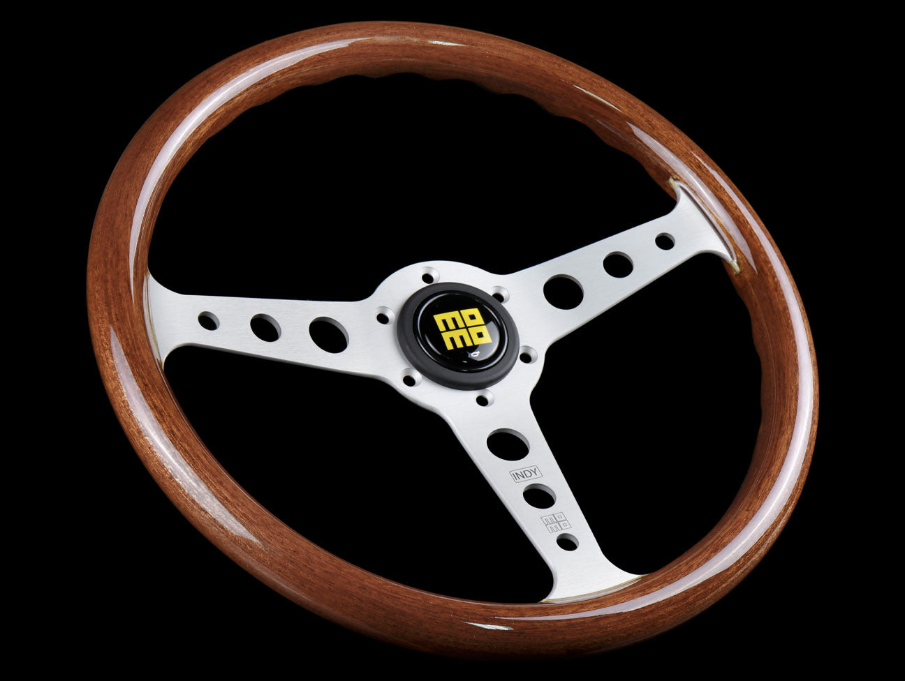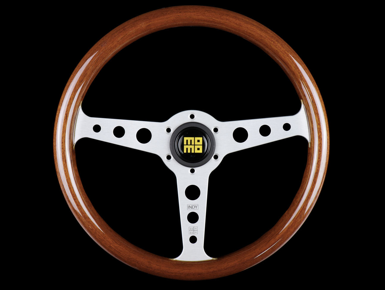 The MOMO Indy steering wheel is finished in beautiful mahogany wood, accented with brushed aluminum cut-out spokes. Its vintage feel is reminiscent of the classic wooden steering wheels of yesteryear and reflects MOMO’s fifty-year heritage, which began in 1964.