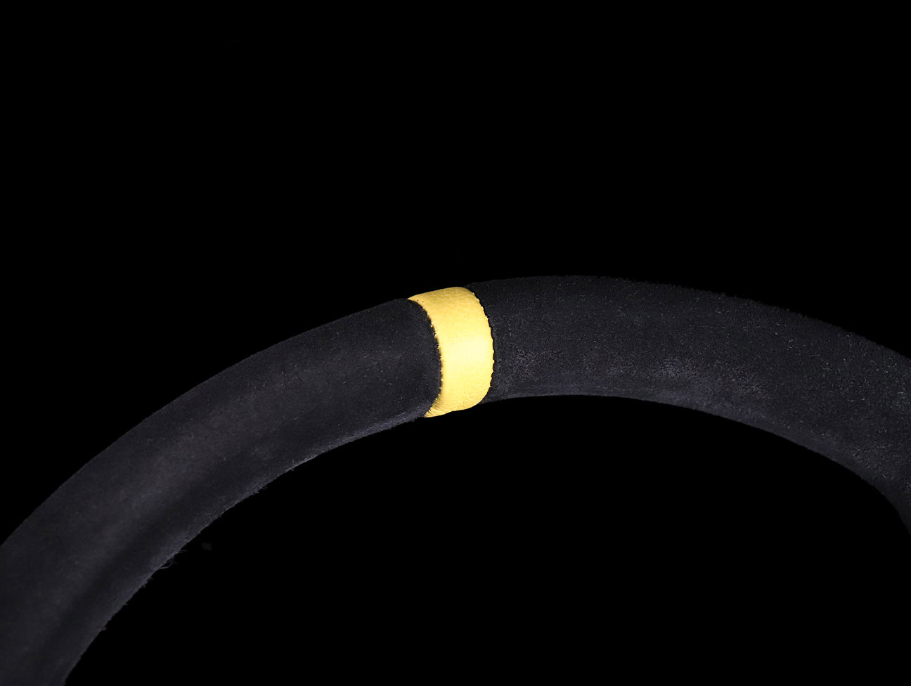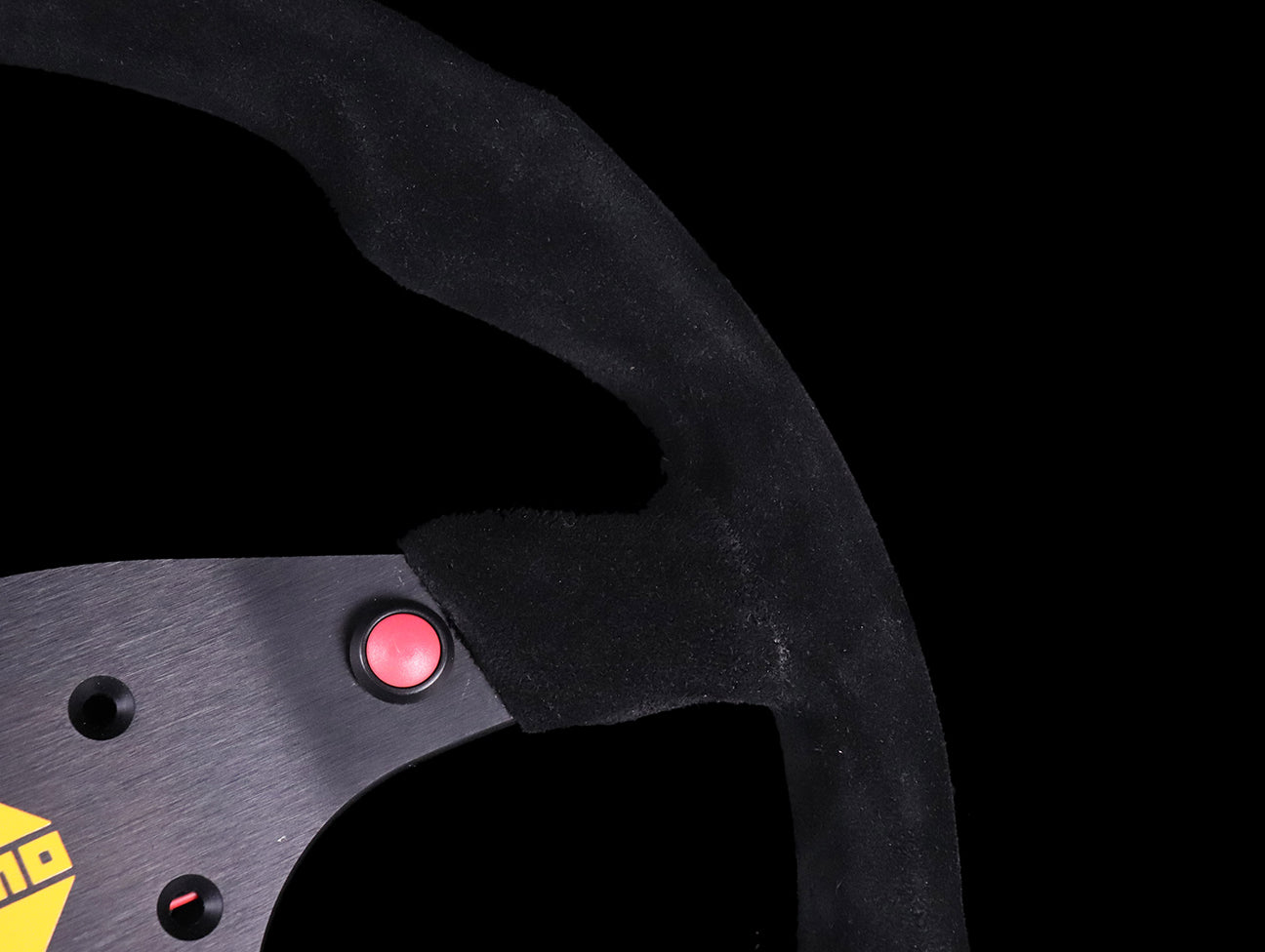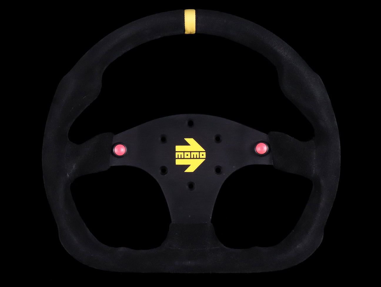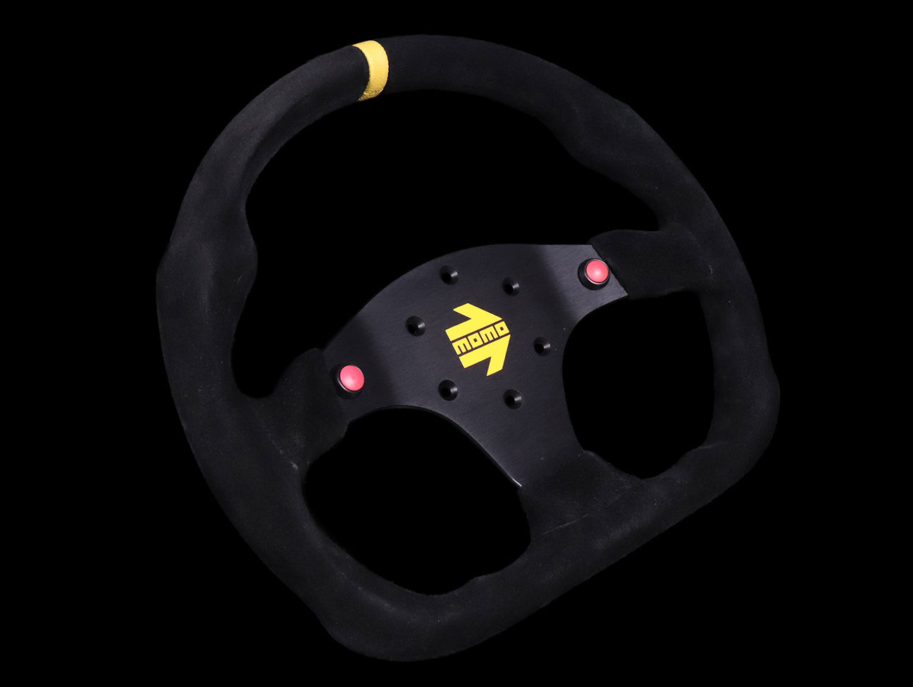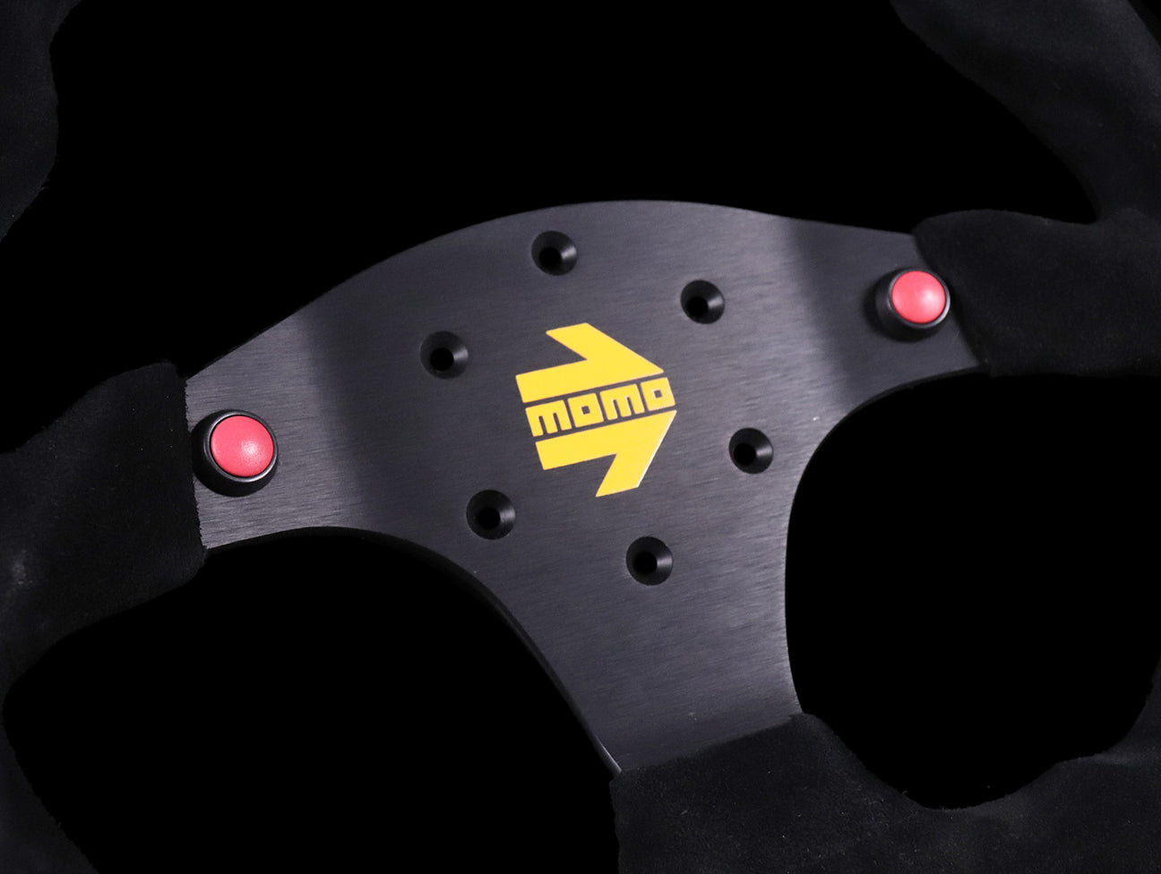 - Black suede spokes w/flat bottom and yellow Momo logo
