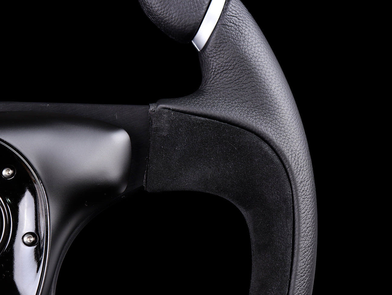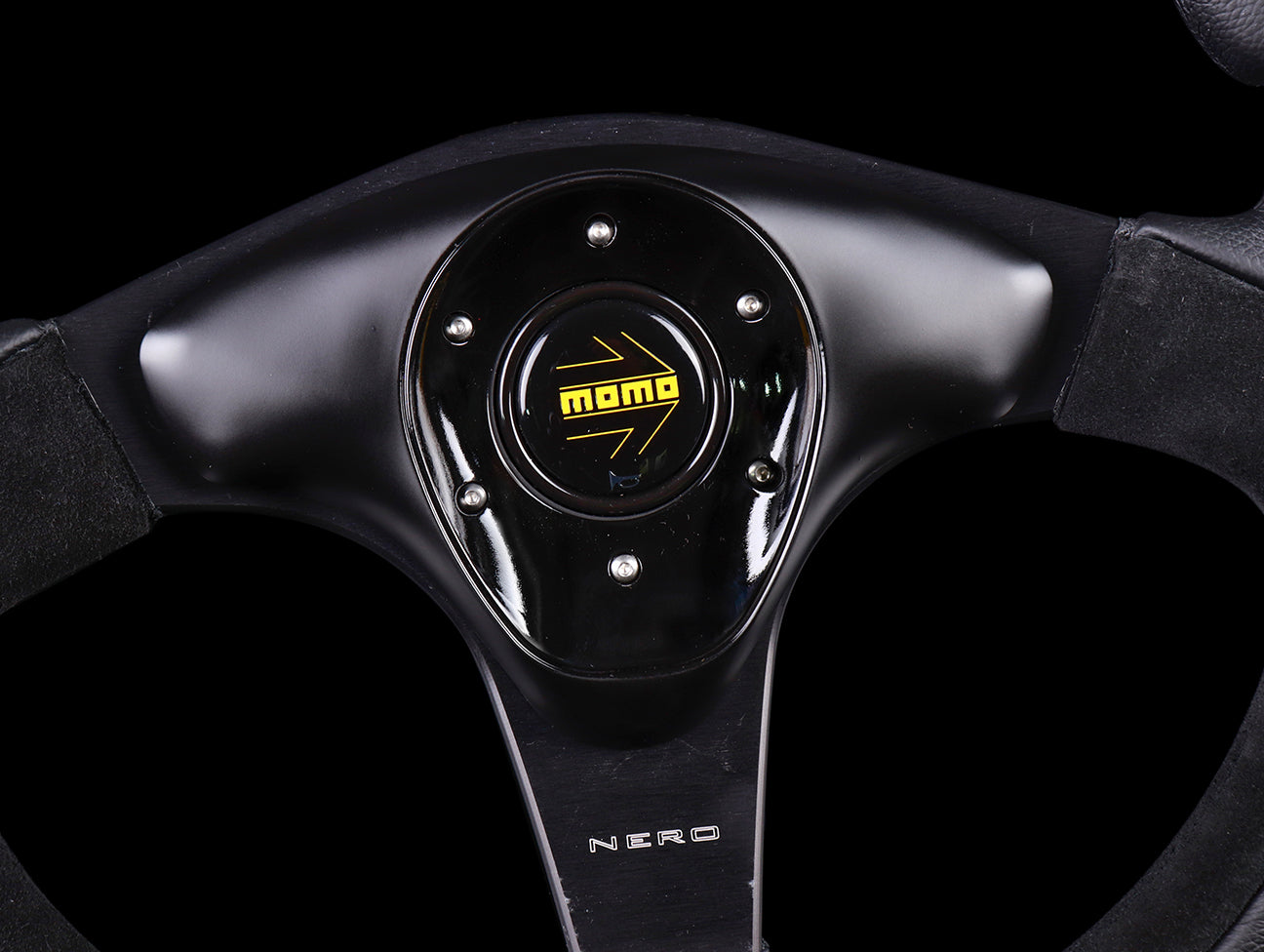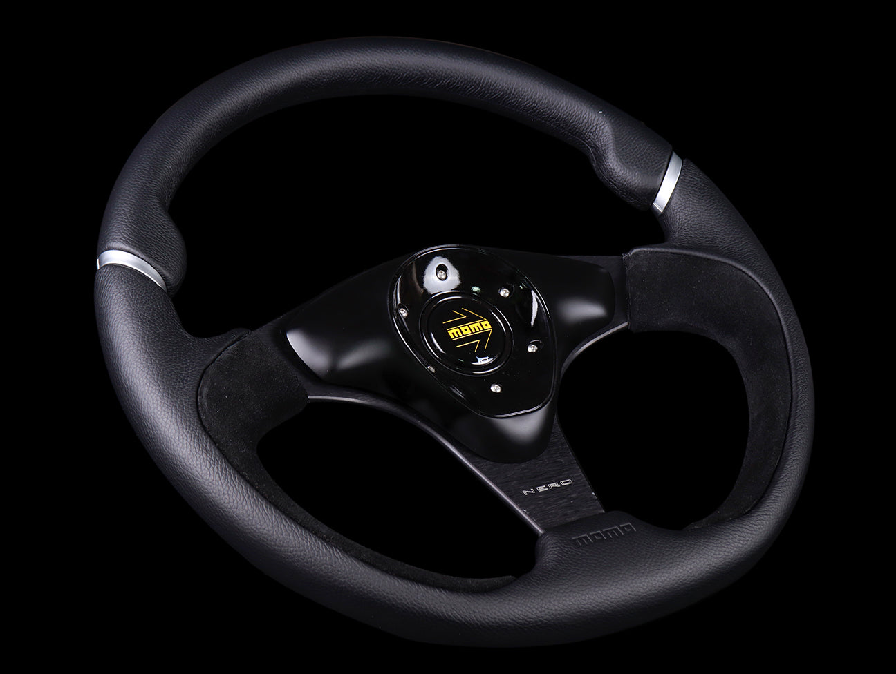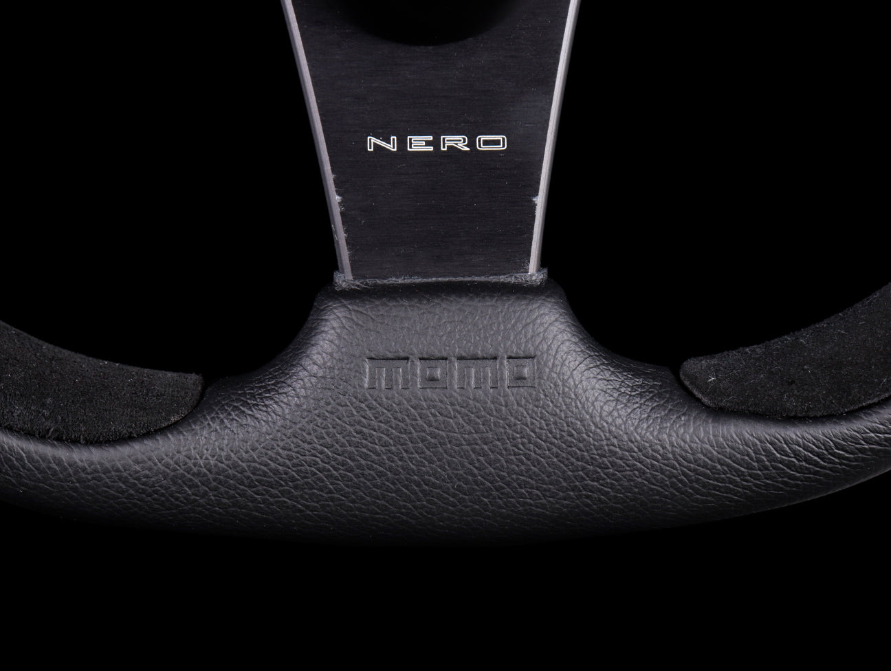 - Top grain black leather with Alcantara insert, chrome accent rings, and Nero insignia