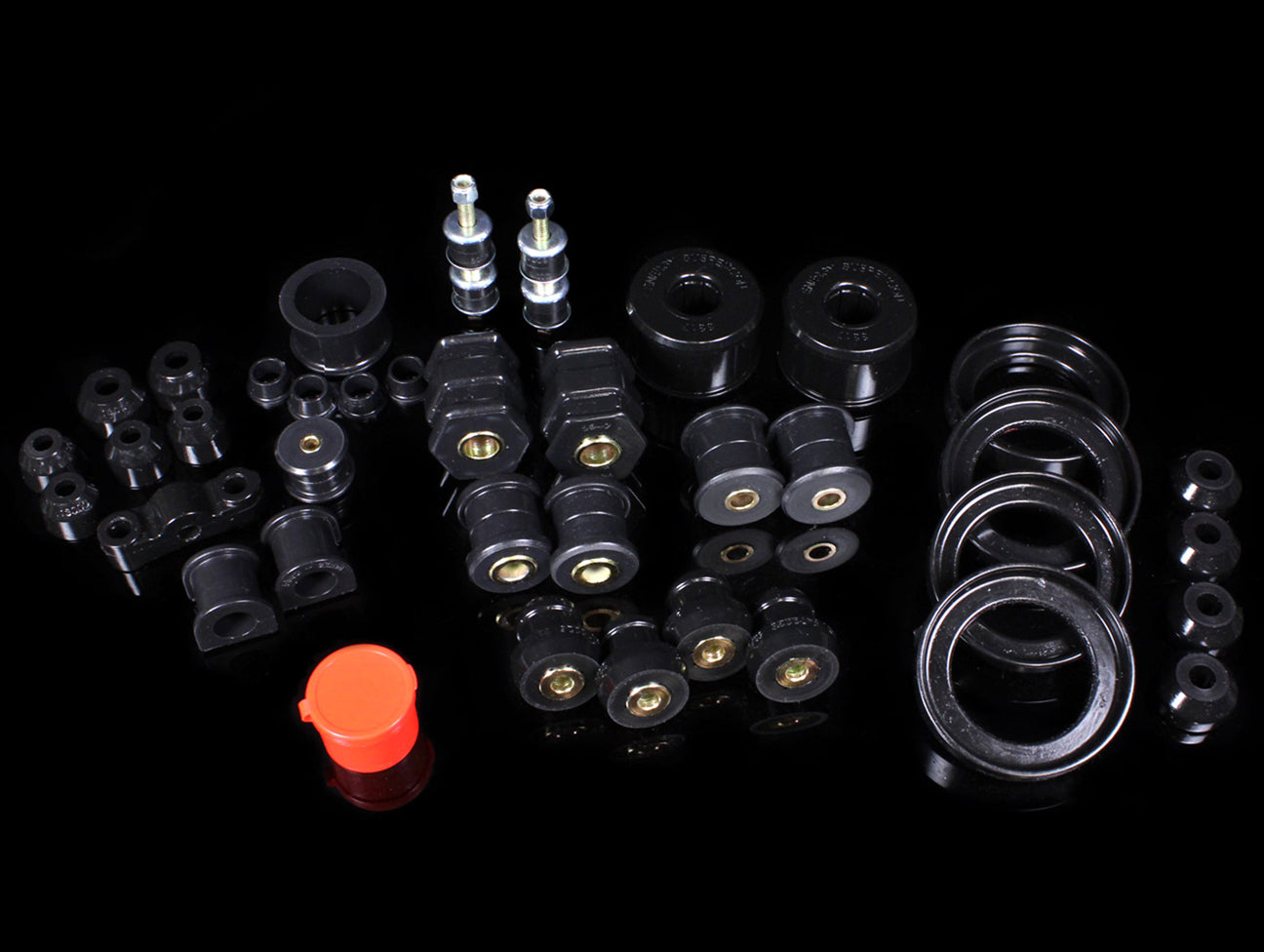 Energy's complete Master Sets, both restores worn mounts and bushings as well as adds a dramatically higher degree of performance to any vehicle. The Master Bushing Set offers complete coverage front to back of the vehicle's chassis. Energy's special formula HYPER-FLEX performance polyurethane components, which is higher durometer (firmness) material and re-engineered performance minded components, assures long-lasting performance in all sets. Performance many O.E.M. bushings and mounts just can't offer. For cars on the street and weekend racers (both front and rear wheel drive), yet so good–successfully used in pro racing!