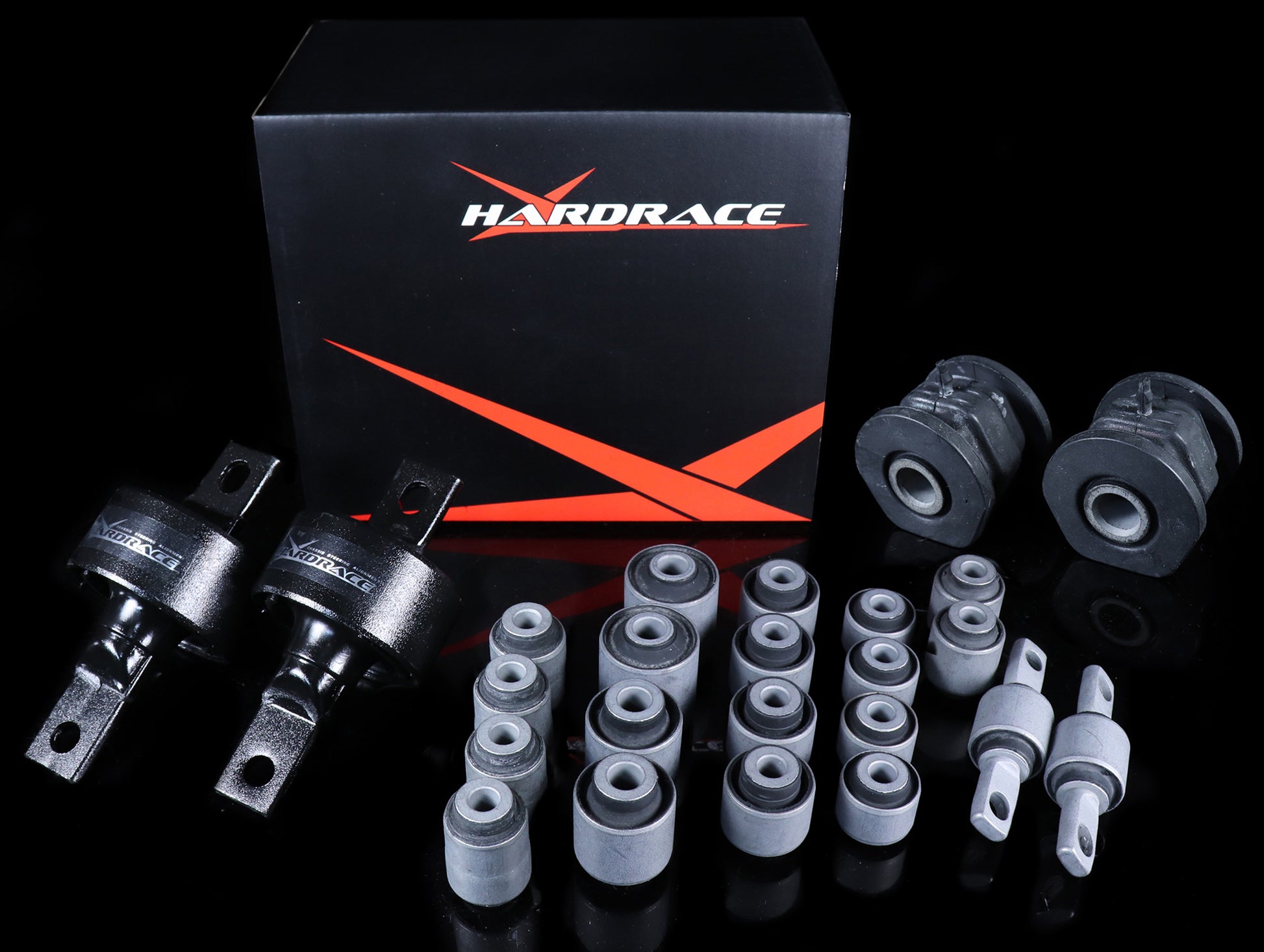 All Hardrace bushings kits are made with reinforced rubber bushings that provide advance stability during high-speed or hard cornering w/out sacrificing daily street driving comfort.