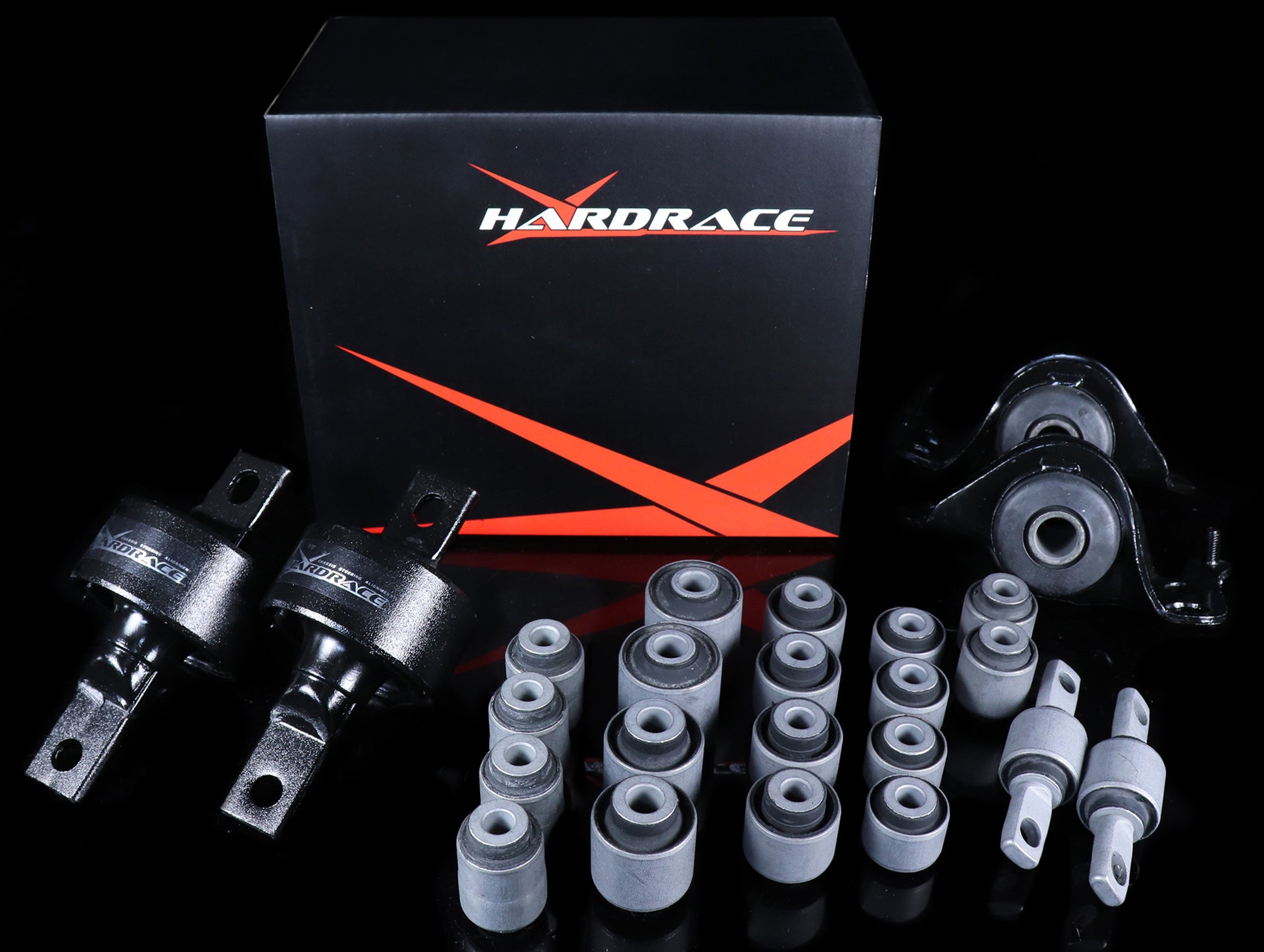 All Hardrace bushings kits are made with reinforced rubber bushings that provide advance stability during high-speed or hard cornering w/out sacrificing daily street driving comfort.