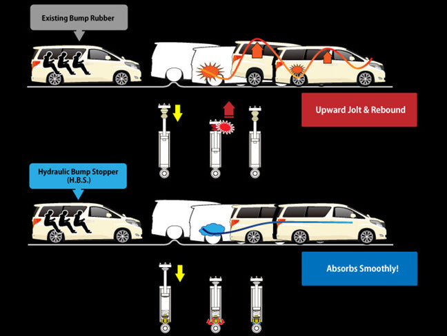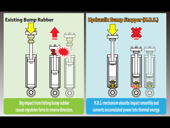 RX1 coilovers are equipped with new "Hydraulic Bump Stopper (H.B.S.)" feature which has been tested and proven effective in the world's harshest motorsports including World Rally Championship and European Rally Championship. When a lowered vehicle goes over big bumps, urethane or rubber bump stopper often causes a big upward jolt and/or rebound and can disturb controllability. On RX1, H.B.S., mounted inside the shock absorber, effectively generates damping force near and/or at full-bump, to absorb big impact smoothly. Comfortable ride in vehicles even at full occupancy will revolutionize the industry.