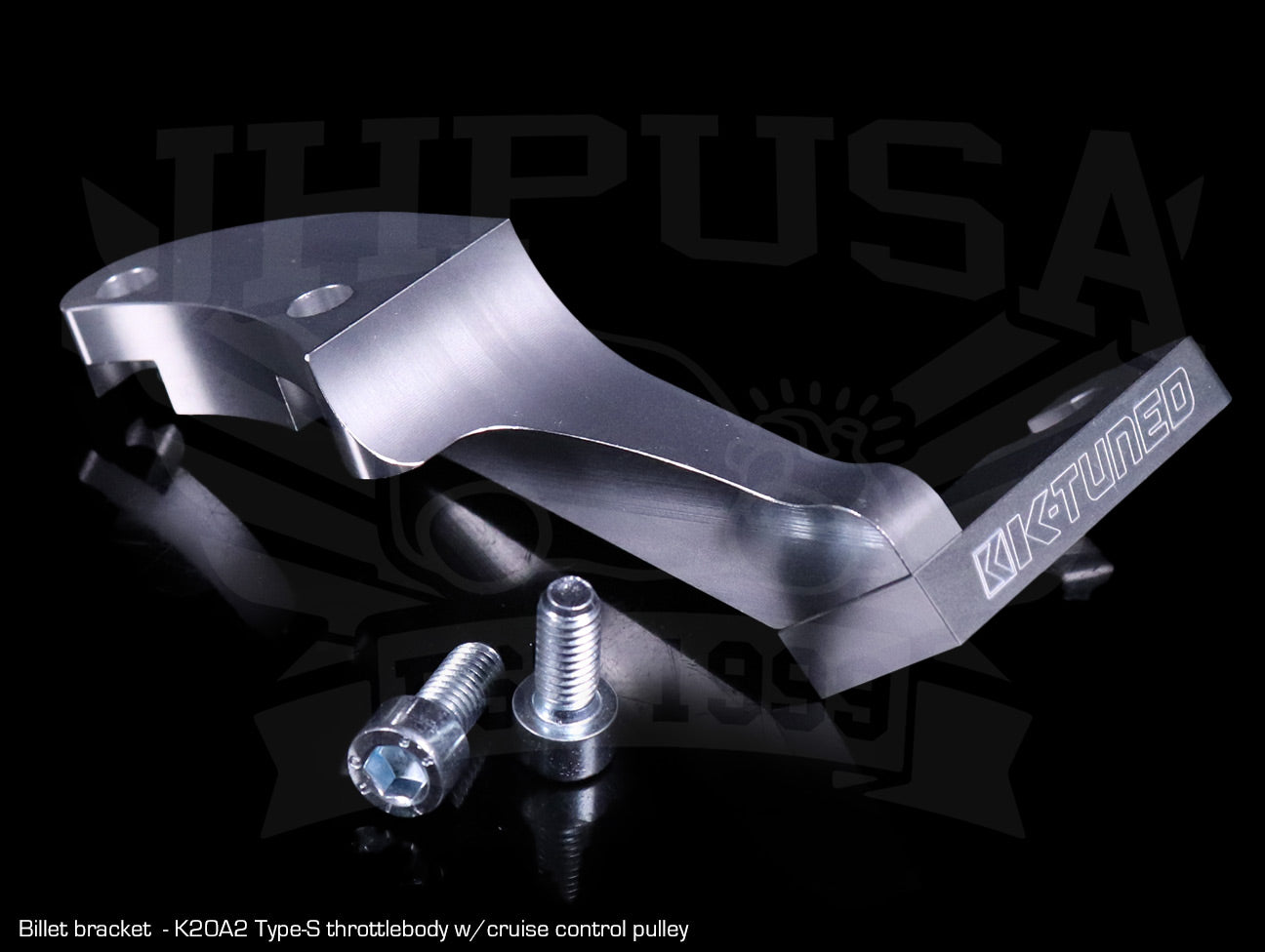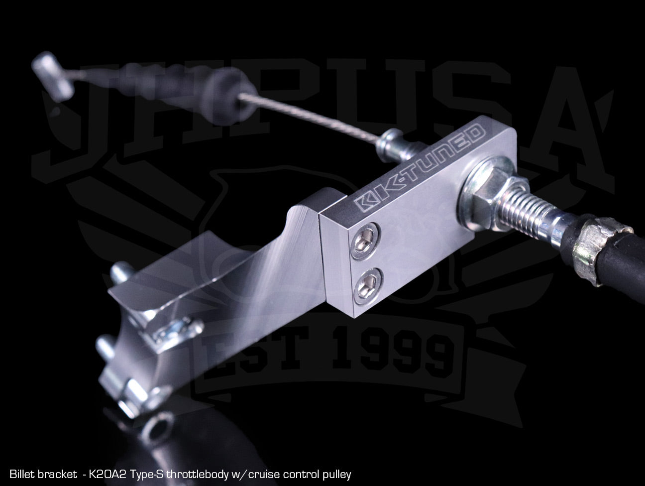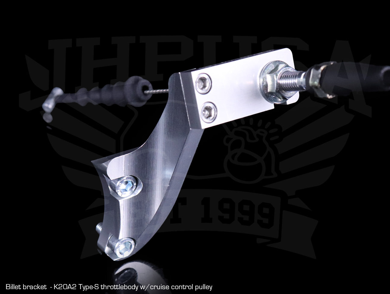 Note: Included billet bracket is only compatible with US K20A2, K20Z1, and EP3 K20A3 throttlebody's that have a cruise control type throttle pulley. Not compatible with JDM K20A, BDL, Skunk2, or other aftermarket throttlebody's with non cruise control type throttle pulley.