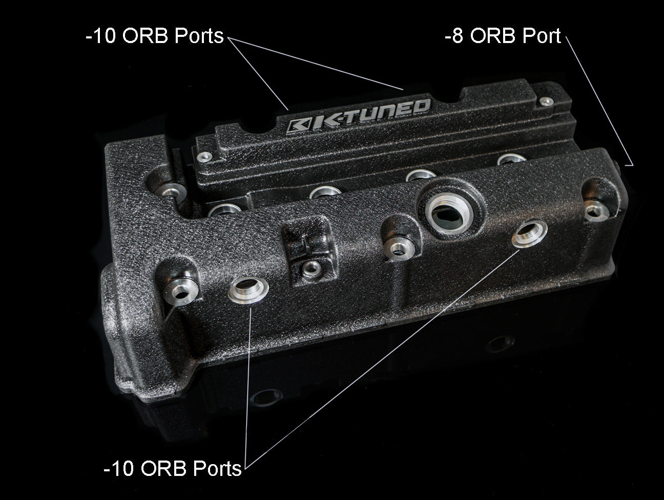 K-Tuned's limited release wrinkle red valve cover perfect for boosted or high HP K-Series Cars. Features two -10AN ports on the front, two -10AN ports on the back, and one -8AN port to replace the stock breather. Four -10AN plugs are included and one -8 ORB to 5/8 barb for stock breather. Hardware and spark tube gaskets are included.