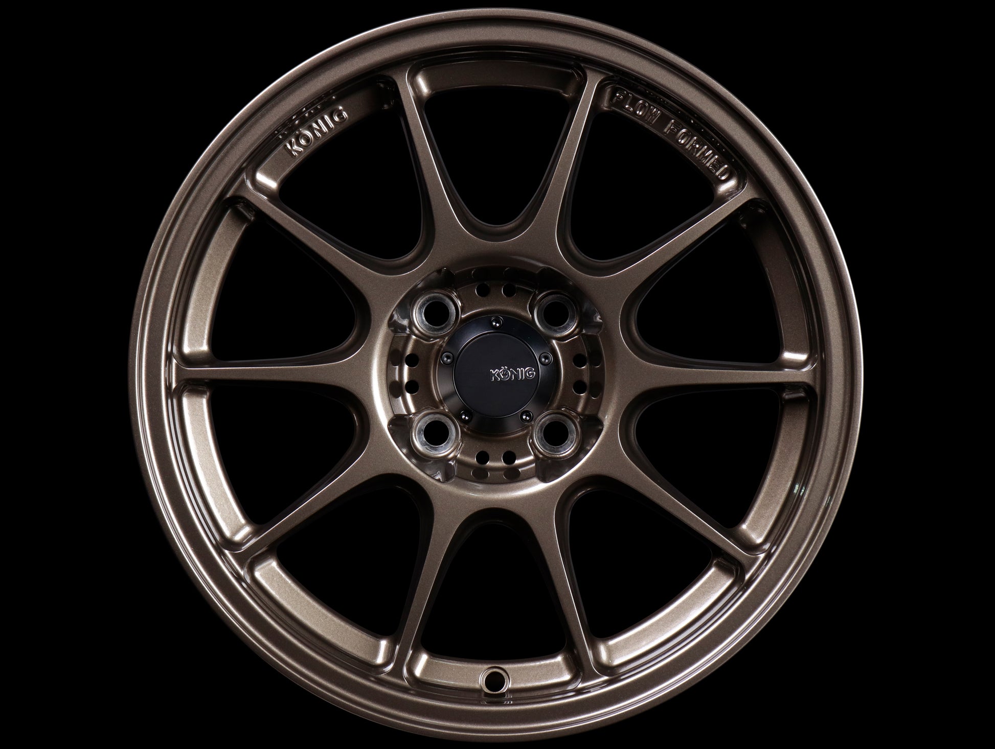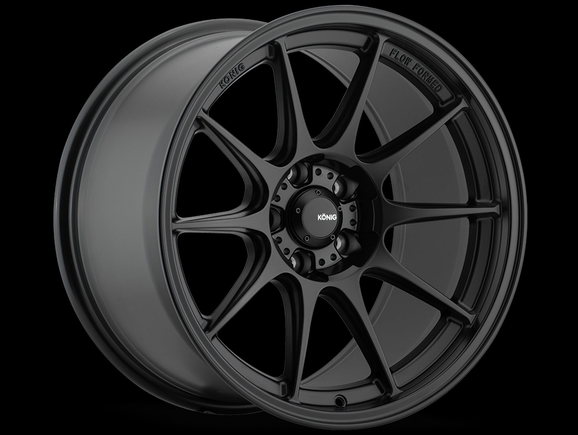 The Dekagram is a lightweight, 10-spoke design that is developed with flow forming technology that offers benefits for both track and street use. Motorsport inspired, the Dekagram’s spoke profile design lends to efficient brake cooling as well as exceptional brake caliper clearance. With widths up to 10.5″ wide, toughening up the stance on many popular vehicles isn’t a problem. With any wheel Konig develops with Flow Forming Technology, the end result is stronger, lighter and offers greater elongation and shock resistance than a traditional cast design. The Dekagram is finished in Semi Matte Black and Gloss Bronze.
