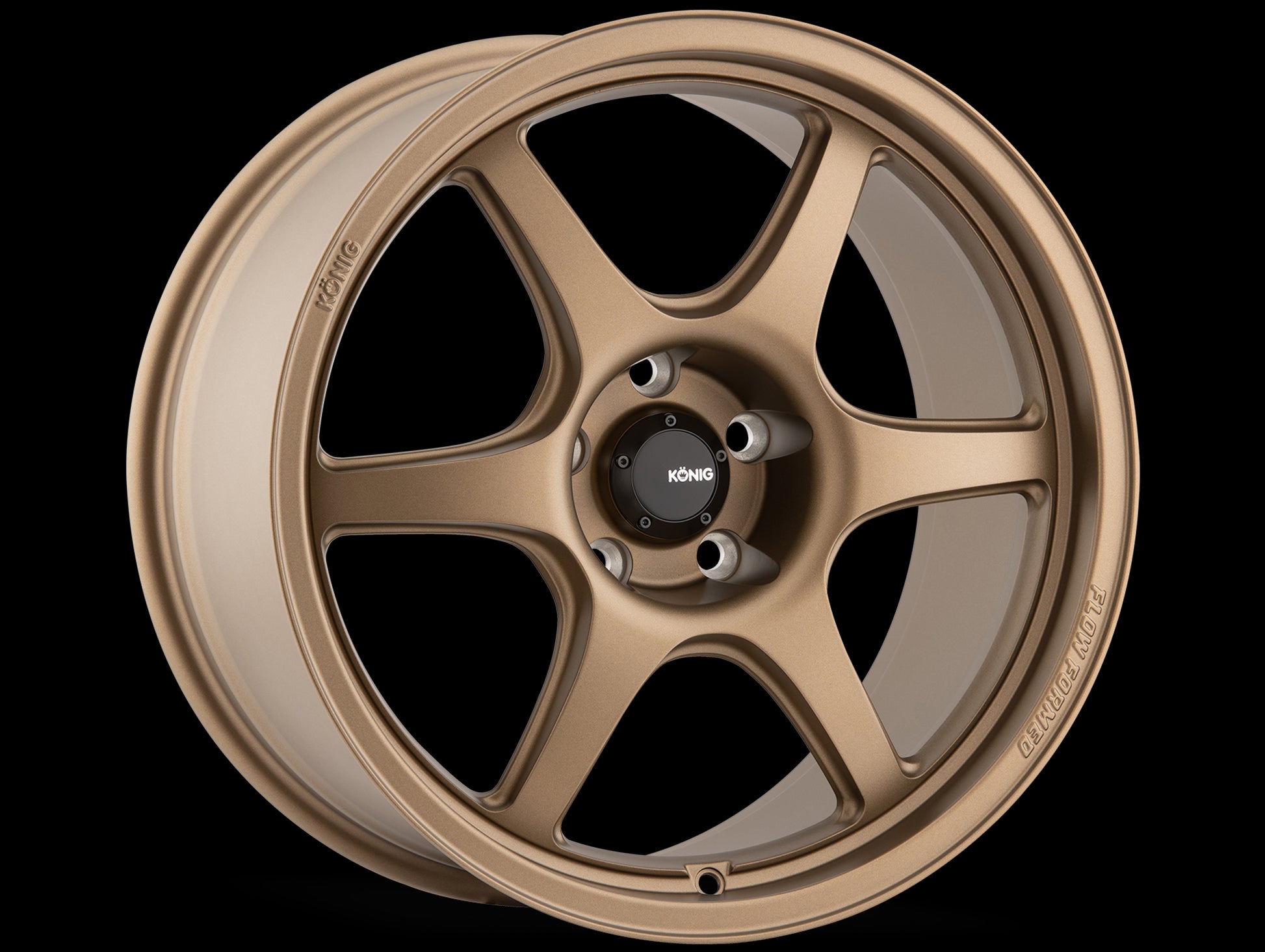 The Hexaform is a 6-spoke design built with flow-forming technology. Available in a NEW! Gloss White, Matte Bronze and Matte Black finishes! Konig has integrated feedback from their motorsport teams, racers and drivers into both of their new designs this year. They’ve pushed the face out and allowed for as much brake caliper protrusion as well as overall brake diameter near the drop center. This provides excellent caliper clearance for big brake car and aftermarket big brake kits.