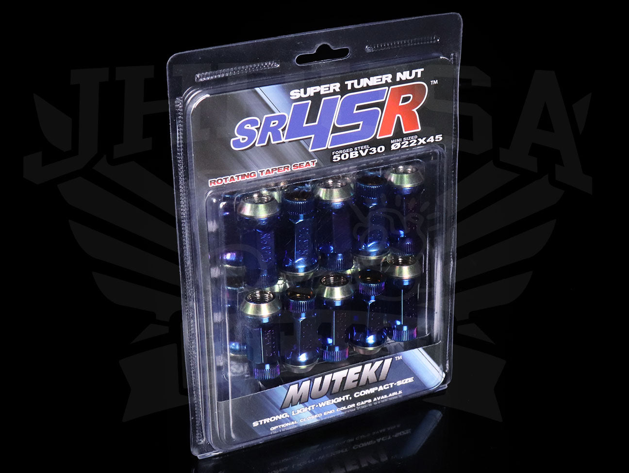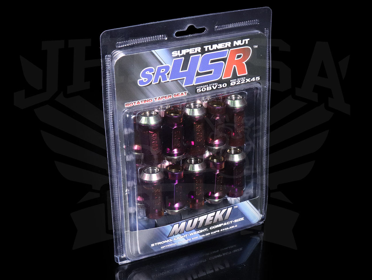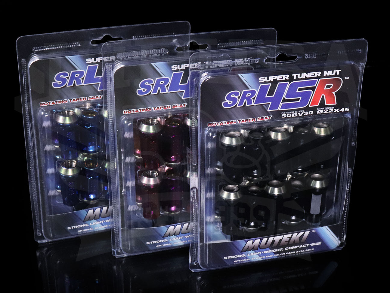 The OEM quality construction of the SR45R lug comes from the use of Cold Forged 50BV30 Steel construction and a oversized 60 degree cone seat for better contact on your wheels. Current available color is Black, Burned Blue Neon and Burned Titanium. Give your car the high end details it deserves with the all new Muteki SR45R lug nuts.