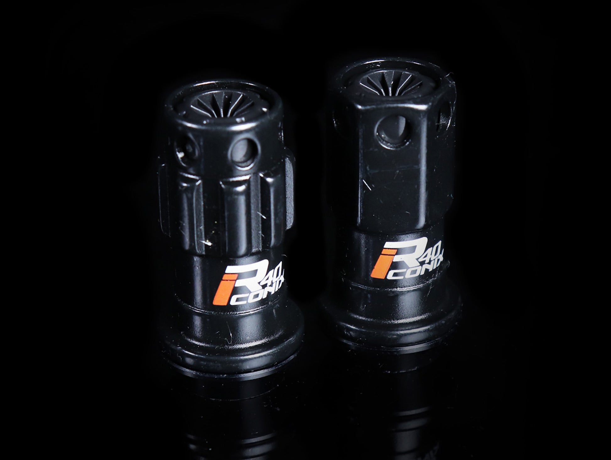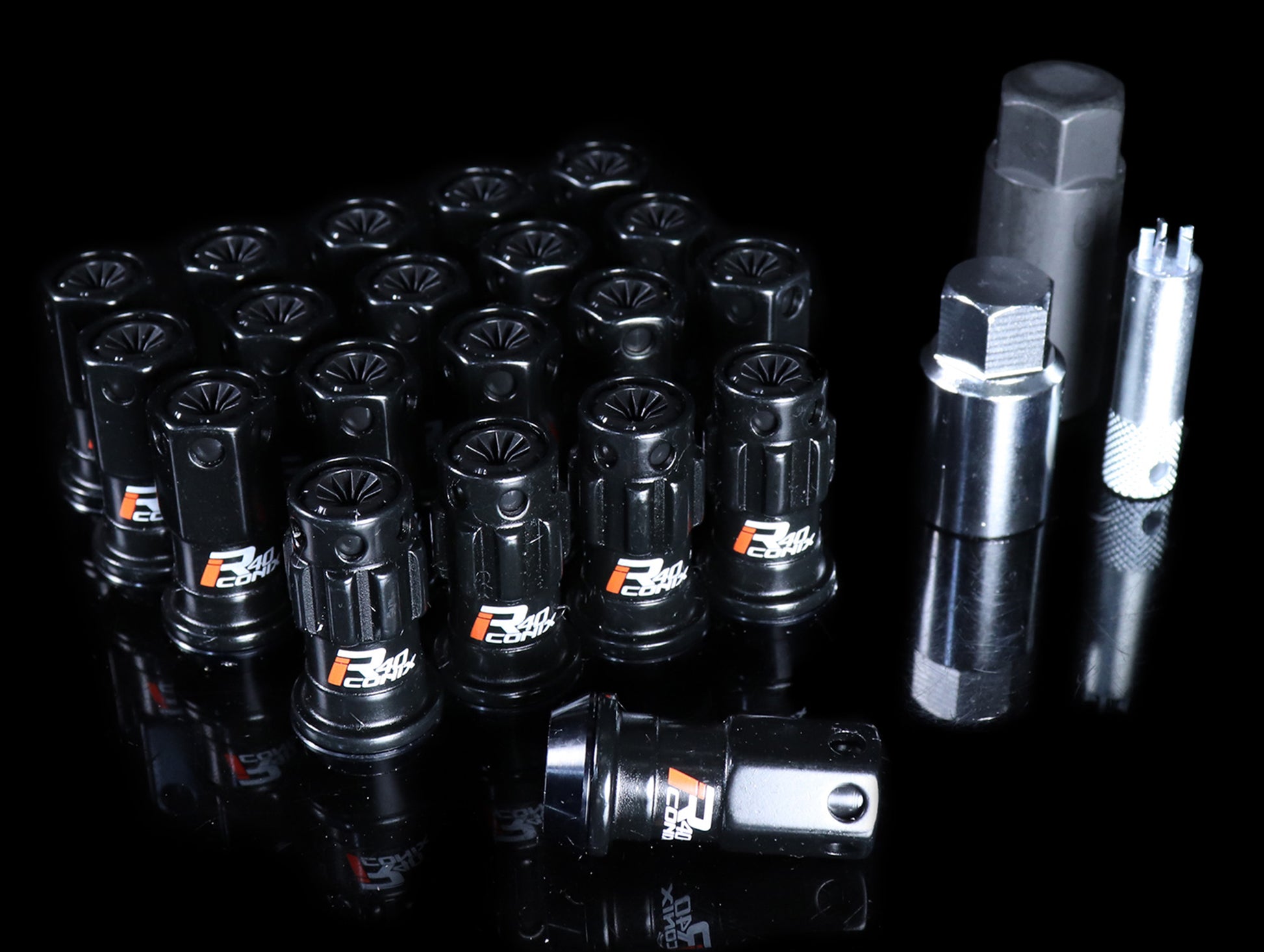 The Kics Racing Composite R40 iCONIX lugs are made of chromium molybdenum steel (SCM435 forging) to resist the harshest of race abuse. The R40 unique feature (patent pending) of this six-sided, hexagonal lug nut is that each lug consists of 2 pieces, where the top of the lugs spin freely from the tapered centering ring. This ensures a much tighter and precise hold than traditional lug nuts. It also minimizes the chances of scratching your wheels. Made of lightweight composite materials, these open ended lugs fit on both standard studs as well as extended studs. The entire set weighs just under 2 lbs! Highly recommended for both street and track enthusiasts. Made from chromoly steel 435. Lessen the chances of ruining your wheels with these impact gun friendly lug nuts.