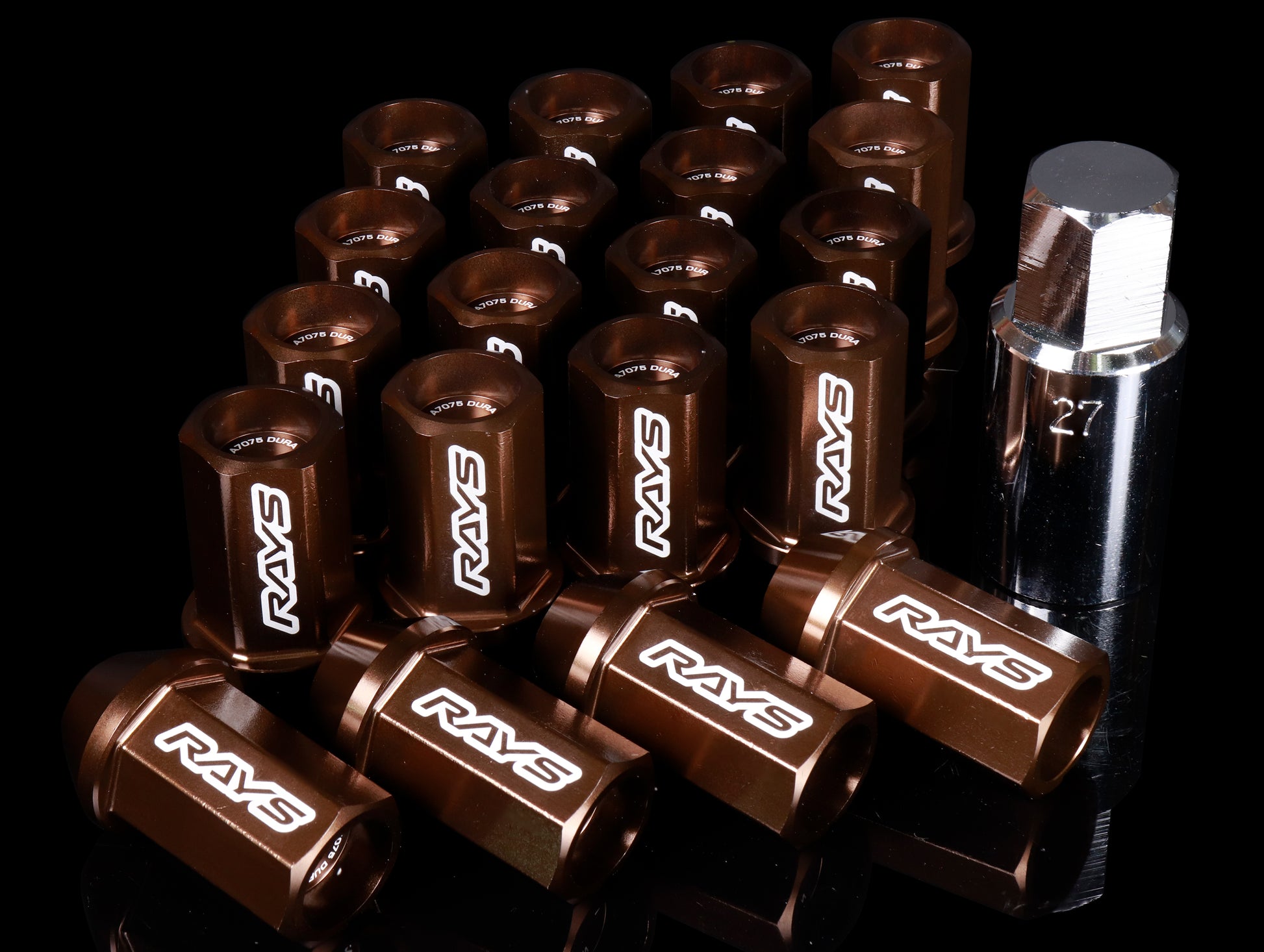 Rays Engineering L42 Dura-Nuts straight type lock & nut set are extended for quick and easy installation and removal. Made from Duraluminum, these lug nuts are extremely strong and light. In addition to the performance aspects, the Rays lug nuts also feature an internally capped end. Locks feature a 7-sided nuts with accompanying key.