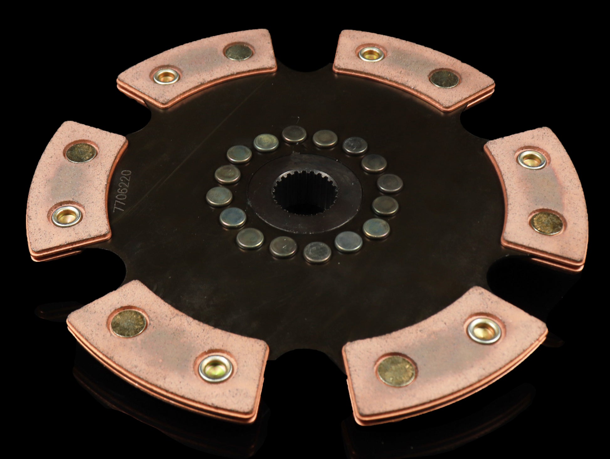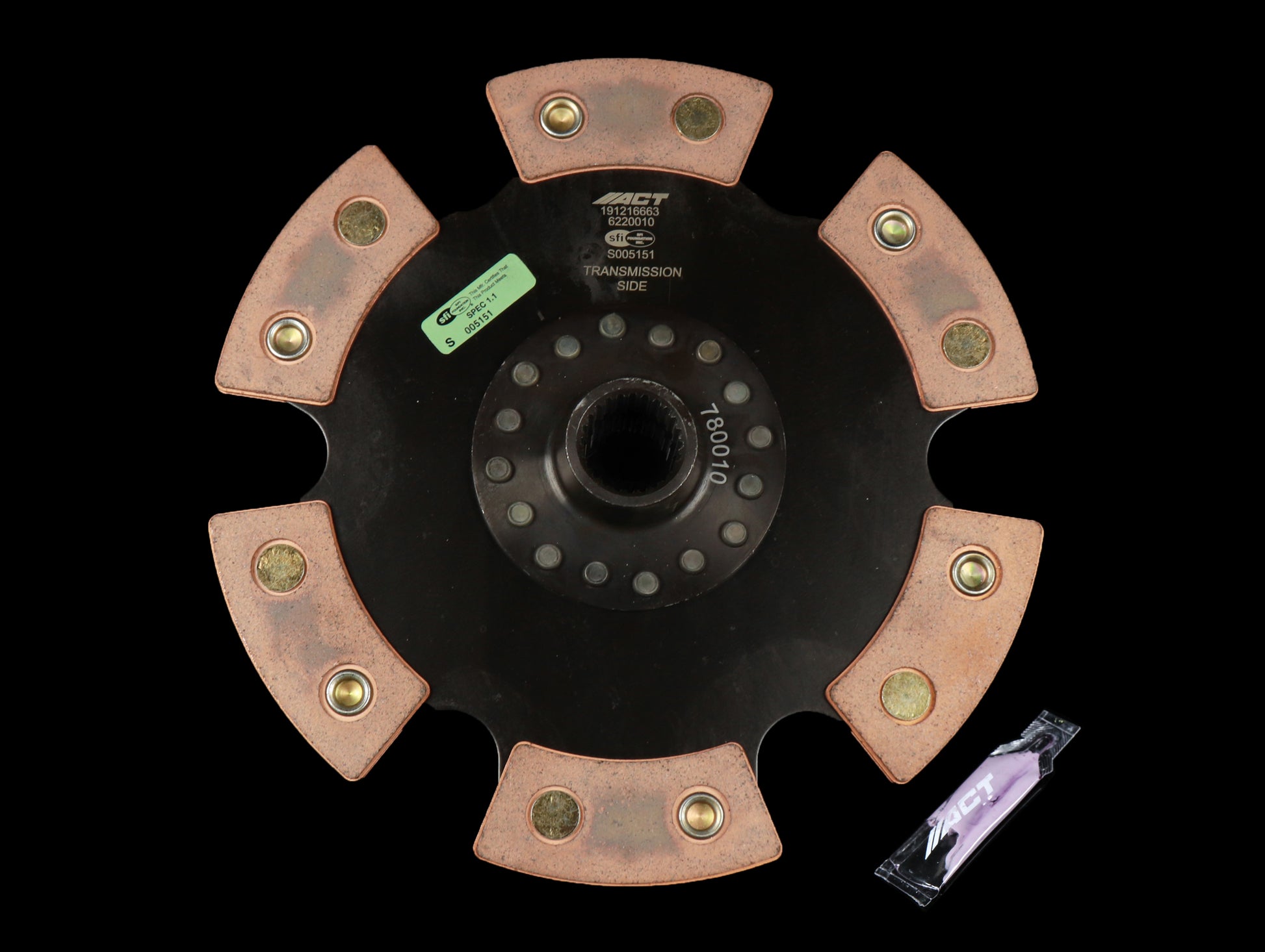 The ACT 6-pad rigid unsprung race disc made with high quality ceramic friction materials. The disc engagement is harsher, but shifting is faster. The race disc features top grade rivets to securely fasten the part together. The rivet design and materials are carefully selected for maximum strength. The 6-pad rigid race disc is recommended for larger clutch sizes to absorb more heat and for smoother engagement.