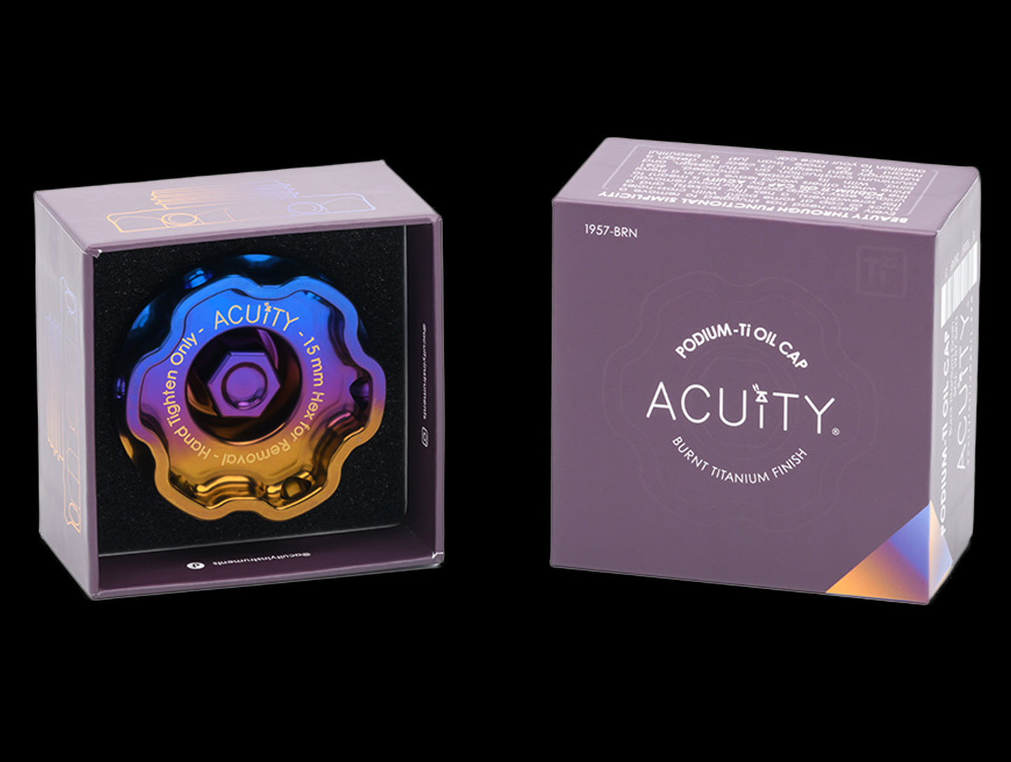 The Podium-Ti Oil Cap by ACUiTY is meant to shine when others would leave you in a literal bind. Most gearheads have struggled to remove a stuck oil cap at some point. The Podium-Ti gracefully avoids such issues thanks to its cross-drilled holes and machined hex that allow removal using a screwdriver or socket. Of course, it also permits hand removal using its gently scalloped profile. The Podium-Ti is carefully machined from 6AL4V titanium, and the finish is applied by hand, making every piece unique. Attention to detail abounds in this design with subtle features like a dovetailed o-ring retention groove, helpful technical markings, and critically placed fillets to help keep the oil cap looking great even after repeated loosening using tools. With its titanium construction, beautiful finish, artful design, and surprisingly light weight, it's clear the Podium-Ti is meant to be more than just a beautiful addition to your race car.
