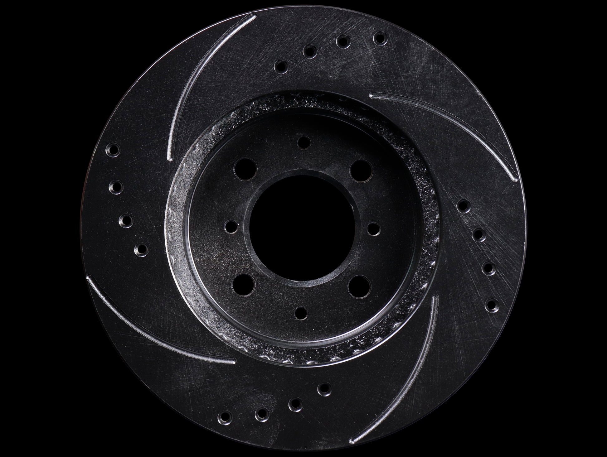 • Cross Drilled Holes - Holes are machined with their exclusive sinusoid curve chamfer, which promotes cooling and minimizes stress. They maximize air circulation, and with absolutely no sharp edge, their "chamfer" reduces the possibility of heat checking and increases both rotor and pad life