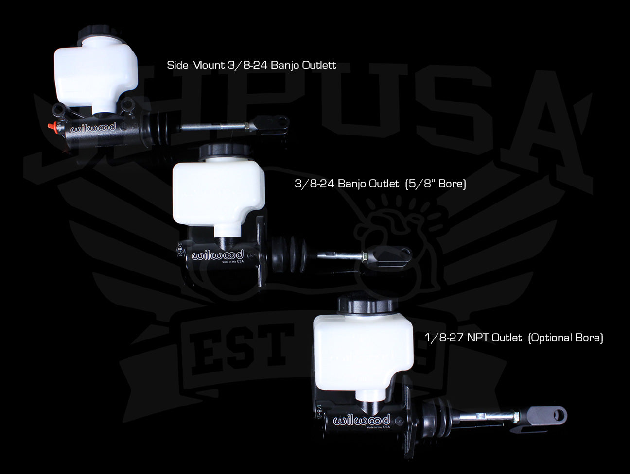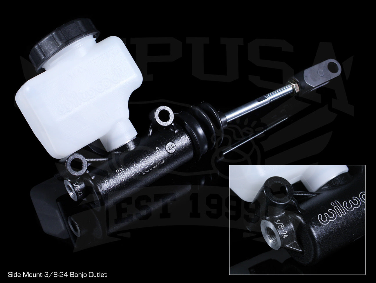 This new version of Wilwood’s Compact Combination (Side Mount) Master Cylinders now features a 3/8-24 banjo outlet. Designed for limited space applications requiring the output capacity of a full size master cylinder. The ultra short 3.37”compact body provides 2.16” of additional clearance between the mounting boss and the fluid outlet. The new body design incorporates integral side mounting lugs with a 3.00” center to distance and no traditional mounting flange, which further enhances its ability to mount in tight spaces. A full 1.12” of piston stroke meets or exceeds the stroke capacity of most full size cylinders. With 1/8” NPT fluid outlet port located at the top radius of the cylinder bore, reduces the chances for trapped air. Enhanced fluid inlet port allows mounting of the standard reservoir included in kit and also contain 11/16-20 internal threads for custom reservoir arrangements. The black E-Coated aluminum body resists corrosion and maintains a durable long lasting finish.