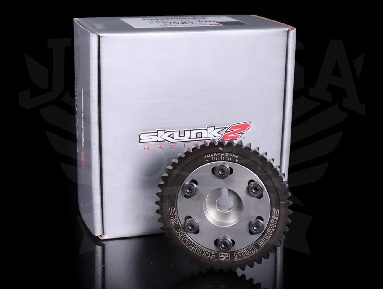 Pro Series Cam Gears feature precision-machined, hard-anodized steel teeth to reduce premature wear with a signature, six-bolt design that eliminates gear slipping. Skunk2’s lightweight design and CNC-machined, 7075-T6 billet aluminum construction reduces rotational inertia, resulting in increased engine response and acceleration. Skunk2’s adjustable cam gears have also been proven on race cars in the most extreme conditions for more than a decade