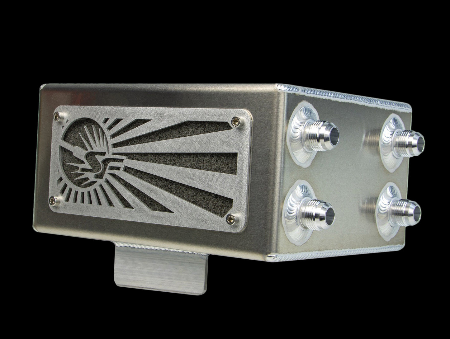 Our catch cans are CAD designed and CNC press punched using state of the art technology. The catch can and all billet fittings are professionally TIG welded to top off that ultra clean look, and each unit ships with an aluminum mounting bracket attached for ease of installation.