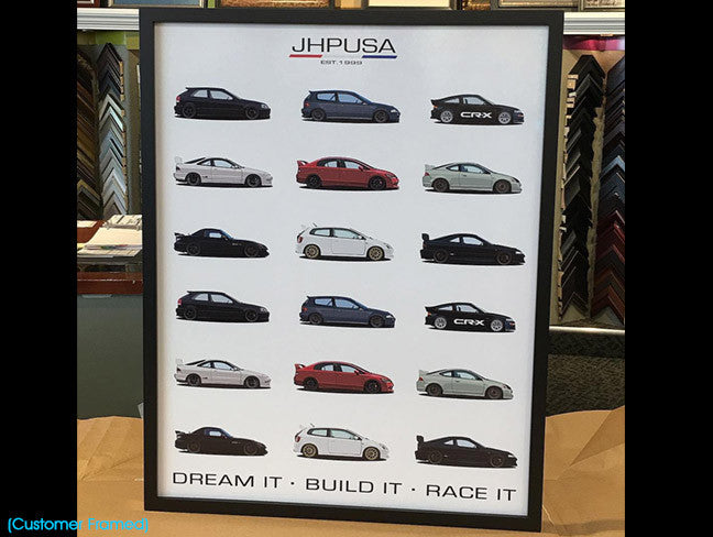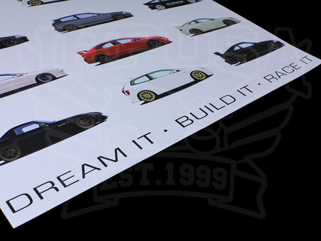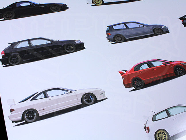 JHPUSA Poster features 9 illustrated classic Honda & Acura chassis's. Some of which we had the pleasure of being part of their build process in some way, shape, or form. These cars were beautifully drawn into vector format by the skillful hand of Jamin of J7artwork. Poster size is 21" x 28".