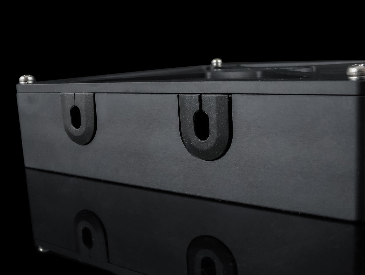 Features 2 rubber grommets giving a simple way to have wires to connect additional io, one round port that can be used for vacuum hose or Link cable connection. Base has four M6 mounting holes to make mounting simple.