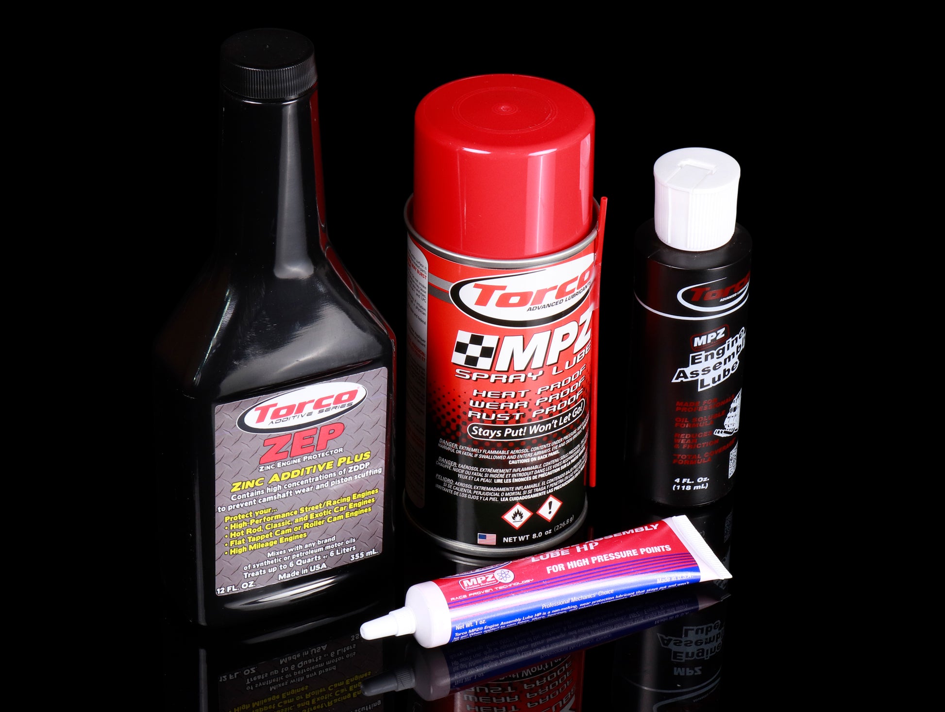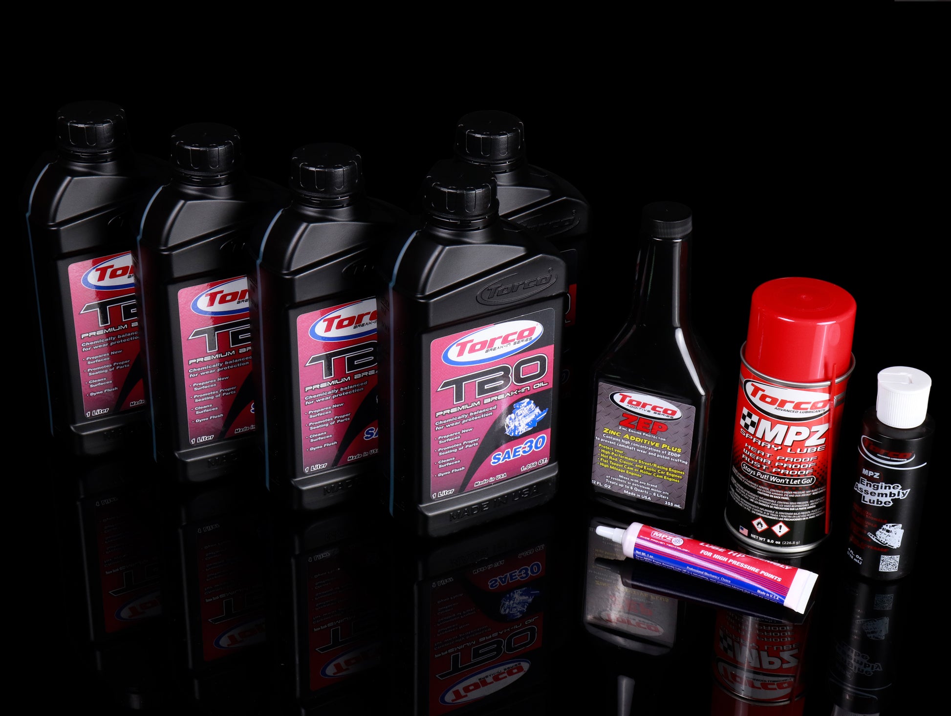 The Torco Engine Assembly and Break-In Kit is absolutely perfect for your engine rebuild. You get every lubricant and additive that your engine needs all in one kit. To start off, you get the best, specific engine break-in oil on the market. Torco's TBO SAE 30 or 40 weight oil is a high-detergent oil that "scrubs down" any contaminants left in new engines from the rebuild/production process. This oil also provides a suitable hydrodynamic film for new bearing protection and is made to withstand viscosity break down in order to maintain proper separation of parts. Perfect for those motors being broken-in on the dyno. Next is the ZEP, Zinc Enhanced Engine Protector, which you will use on the next oil change after draining the TBO. The ZEP will give the next oil you use the extra lubricating properties it needs in the early stages of the engines life. With it's high zinc, moly and phosphorus content, the ZEP will protect all high stress and contact points inside your engine. The ZEP will also coat all engine parts and protect them from "dry starts". All in all, the ZEP is a friction fighting chemistry that adds wear protection back into your motor oil and raises the API levels of phosphorus and zinc to what they used to be, before the API lowered those levels years ago. Furthermore, the best engine assembly lubricants are included in the kit: Torco MPZ Engine Assembly Lube for the bottom-end, Torco Engine Assembly Lube HP, for the camshafts/rocker arm assembly and Torco MPZ spray lube, for the final spray down before the valve cover is placed atop your finished project.