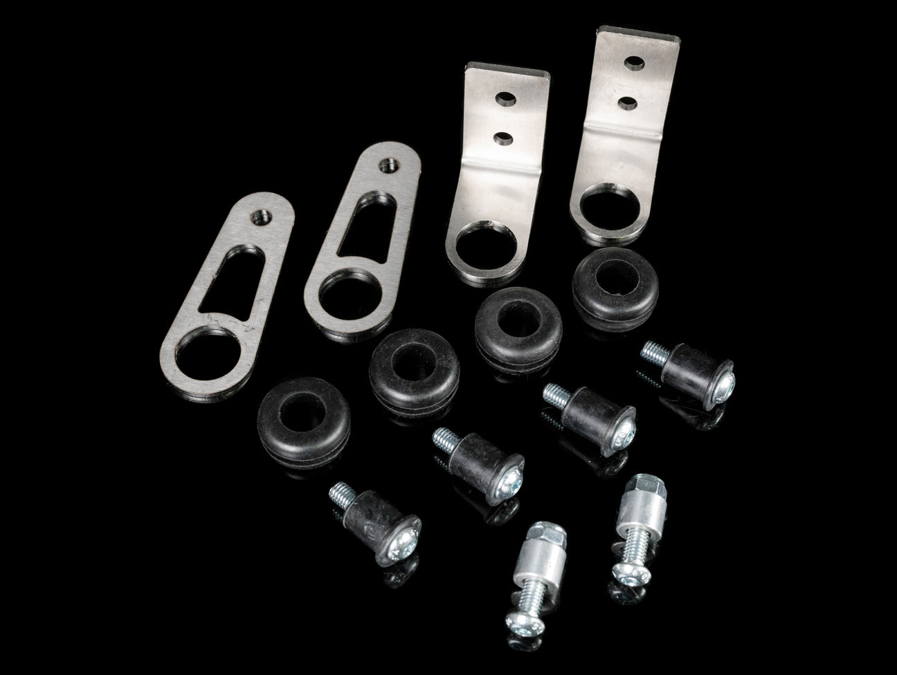 These rad brackets are designed to use the factory DC2 lower brackets and a full RSX/EP3 radiator when doing a swap or our provided lower brackets with well nuts. The stainless steel rad stays come with grommets and the hardware needed. No more zip-ties or ugly rad stays for DC2 / EK owners.
