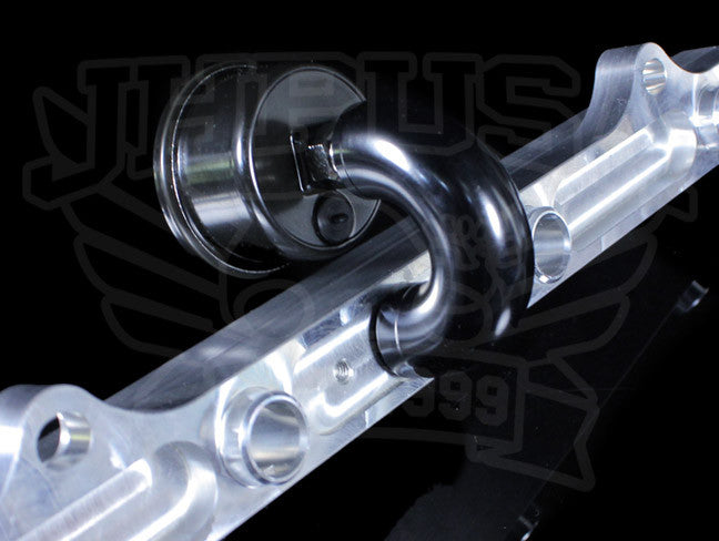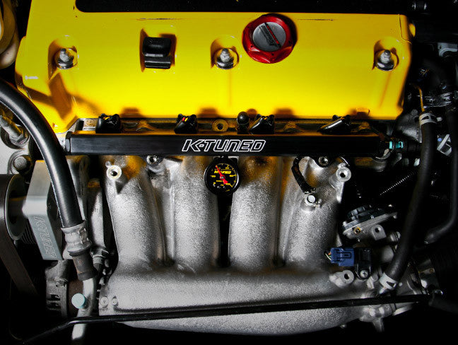 K-Tuned has designed a two piece fitting that uses the existing center port on their billet K-series fuel rail to properly mount the liquid filled fuel gauge just below the K-Tuned logo. The resulting look is very clean, compact, and is very easy to install.