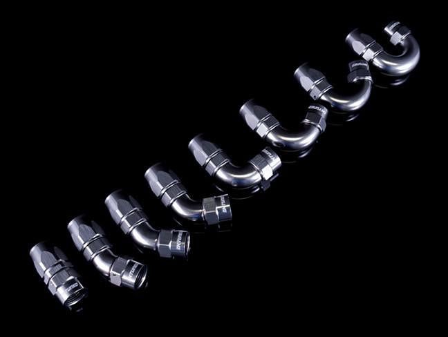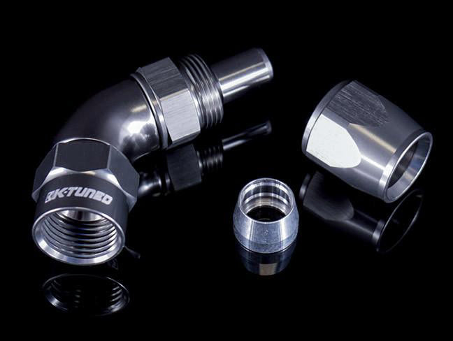 K-Tuned High Pressure Hose Ends were developed for use with K-Tuned High Pressure Teflon Hose (sold separately). The unique one piece high flow design allows for increased flow capacity when compared to conventional crimped hose ends. K-Tuned HP fittings are made from 6061 aluminum and have been hard anodized for compatibility with several different race fuels including E85, E10, and methanol. Note that these fittings also work fine with oils, other lubricants and engine coolant. Assembly is very simple because no special tools are required. Even the larger 12AN and 16AN hoses, which are normally painful to work with, are very easy to assemble. The titanium grey hard anodized finish matches up very well with K-Tuned's dark grey Kevlar HP Teflon Hose.