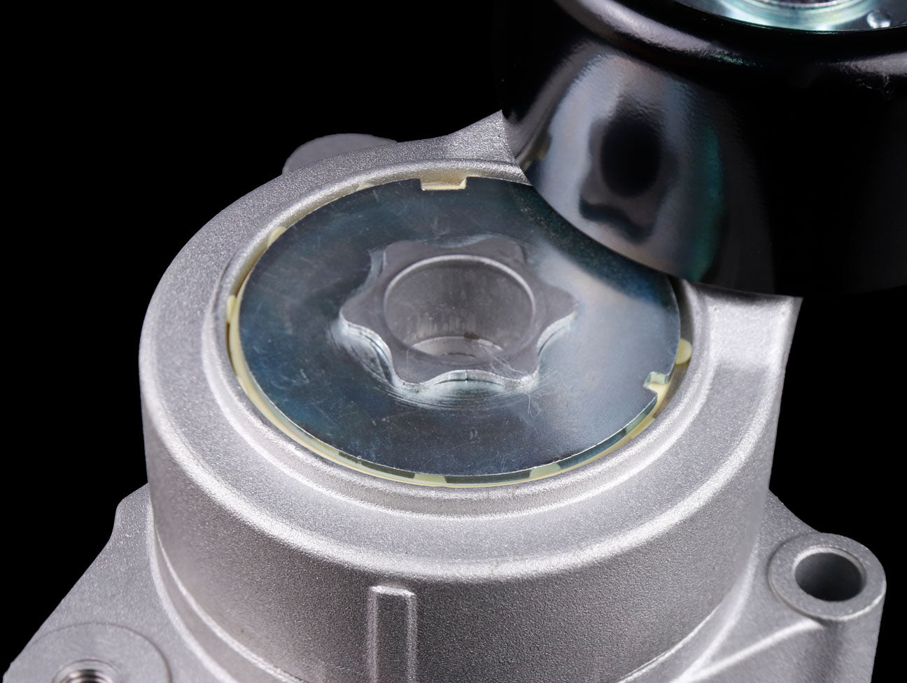 The K-Tuned auto tensioner is a replacement for the OEM unit. It mounts on the water pump and is designed to ensure proper belt tension at all times. Using a 14mm wrench (double wrenching can help with leverage) you can remove tension to install and remove the belt. Ensure that the arrow on the top side is lined up with the window, this is proper adjustment and pressure.