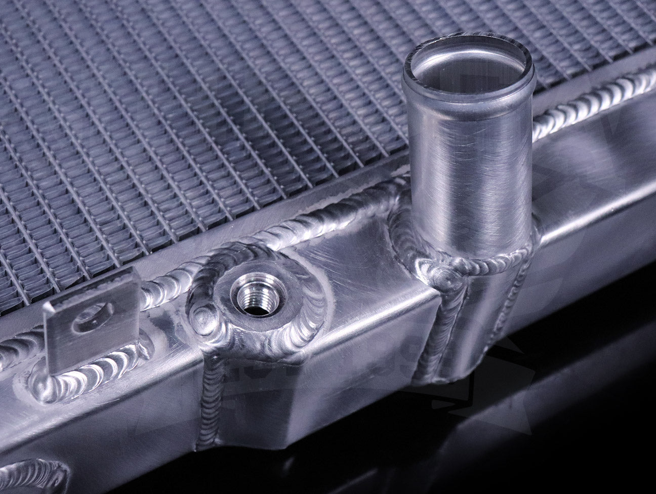 Koyo incorporates application specific mounting locations for all fan shrouds, inlet/outlet hoses and top/bottom mounting pins, ensuring quick and pain-free installs. Each Koyo all aluminum race radiator is Heliarc welded individually by hand. This creates the strongest aluminum to aluminum bond, to mate all components. Precision machined billet filler necks are incorporated on each Koyo radiator for strength, durability and better sealing. Construction under strict quality control and solid boxing result in tubes with optimal coolant flow and fins with highly efficient heat transfer.