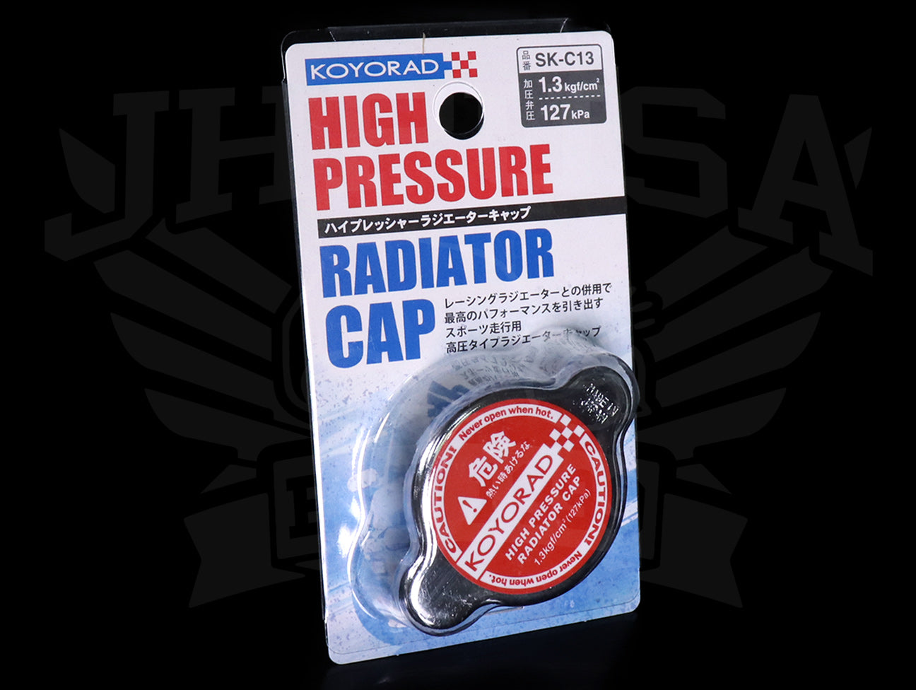 The Koyorad high pressure cap withstands an increased valve pressure rating of 1.3kgf/cm2 (1.3 bar) (18.9 psi) (130 kPa) which increases the boiling point of water and relieves high-performance engines of excessive heat.