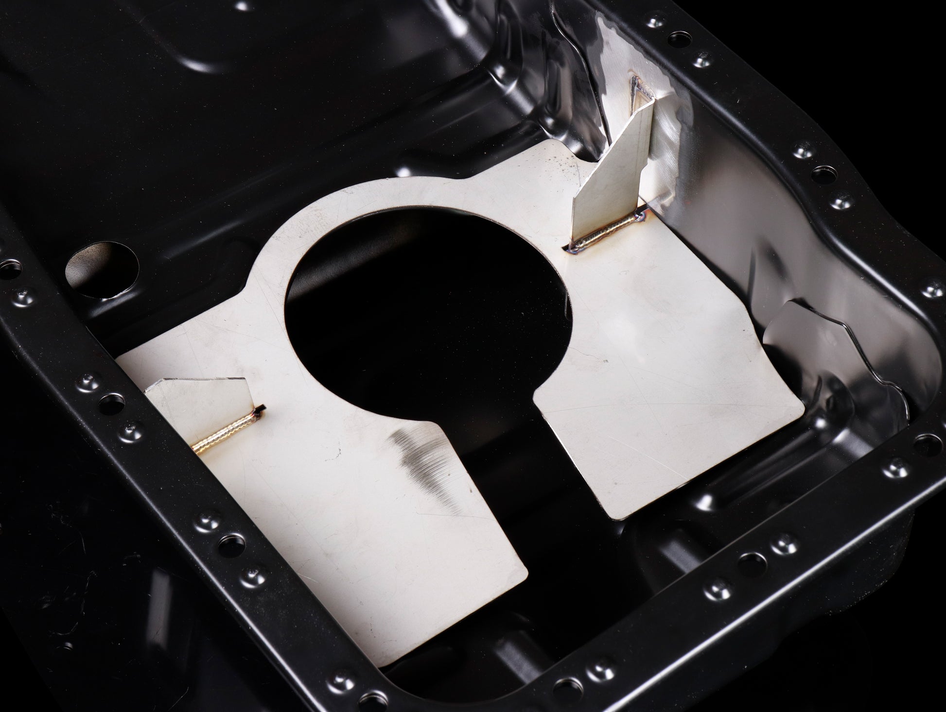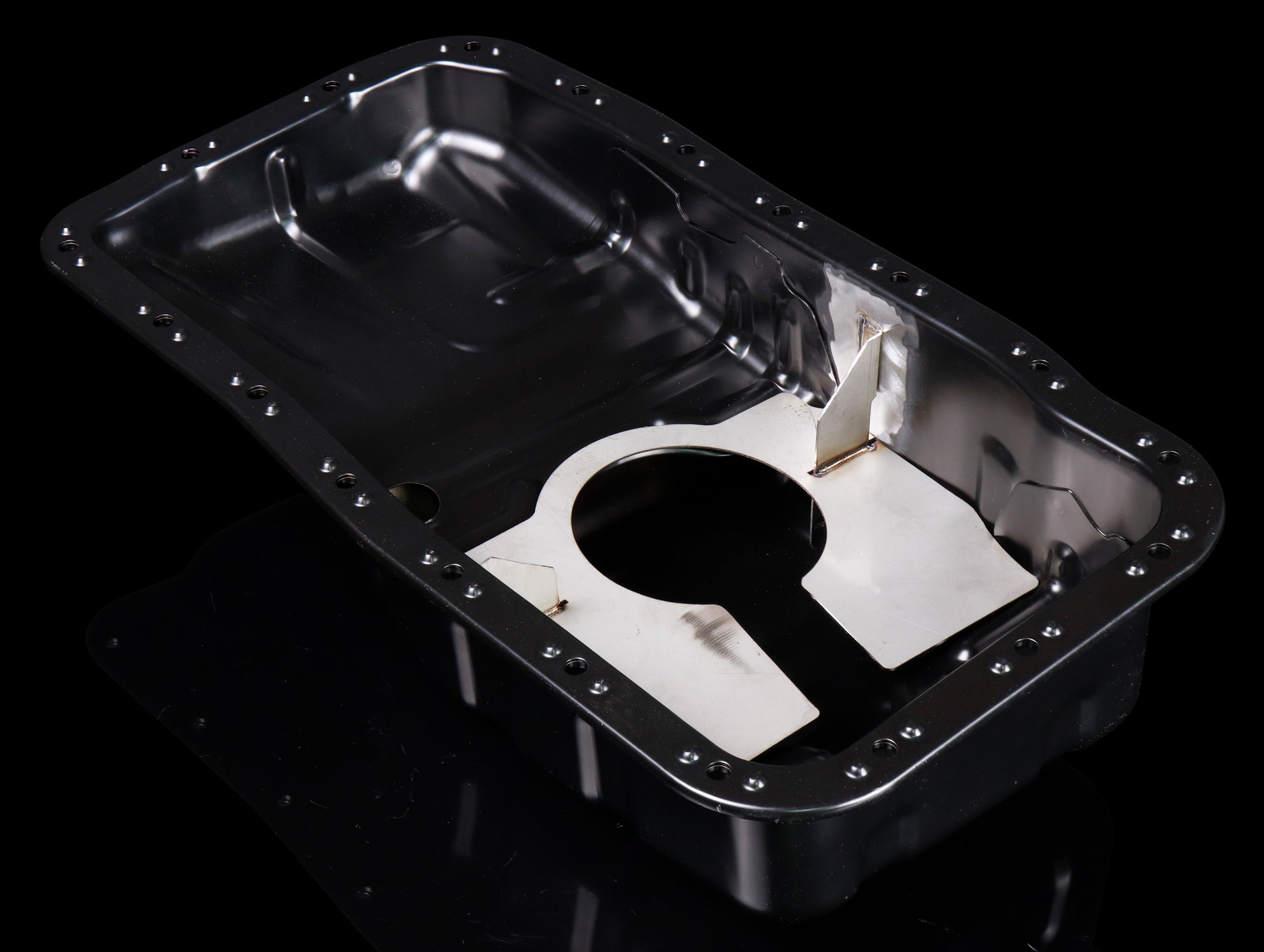 This oil pan is fitted with baffles to prevent oil pressure drop due to oil shifting caused by centrifugal forces. We use high quality stainless steel plates, CNC machined laser cut, and precision bent, and then TIG welded to a brand new OEM-quality steel oil pan. This is the complete oil pan with the welded baffle kit, ready for installation!