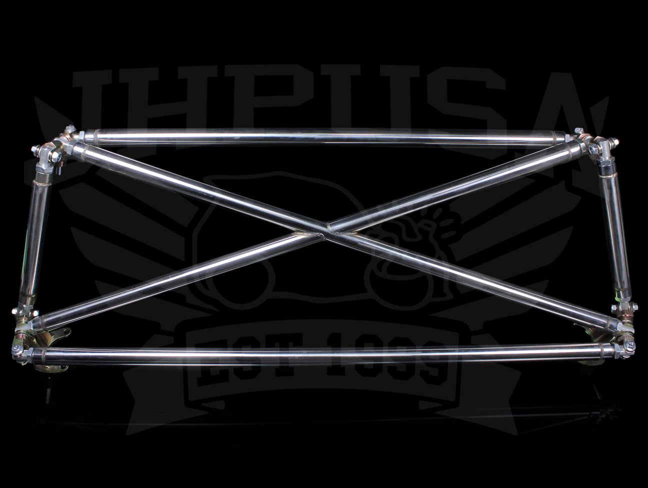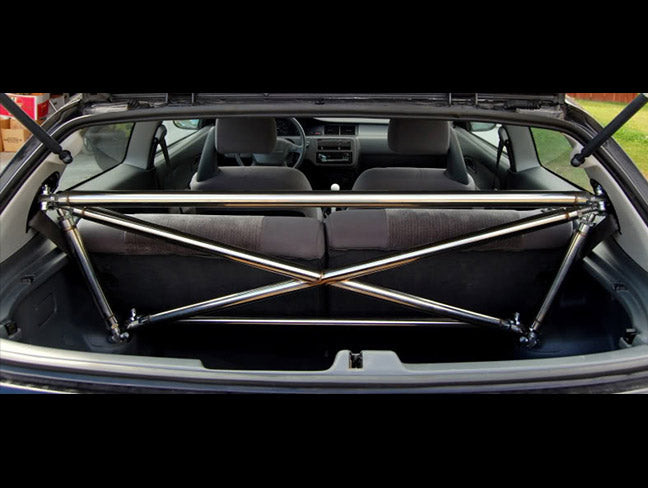PLM Crossbar utilizes the C-pillar and strut points to decrease body flex during hard cornering, while adding a stylish look to your vehicle. PLM has maximized four critical points of the chassis to one stress point while retaining the vehicles rear seats. The improvement is undeniable. You'll feel the difference instantly when installed for maximum rigidity.