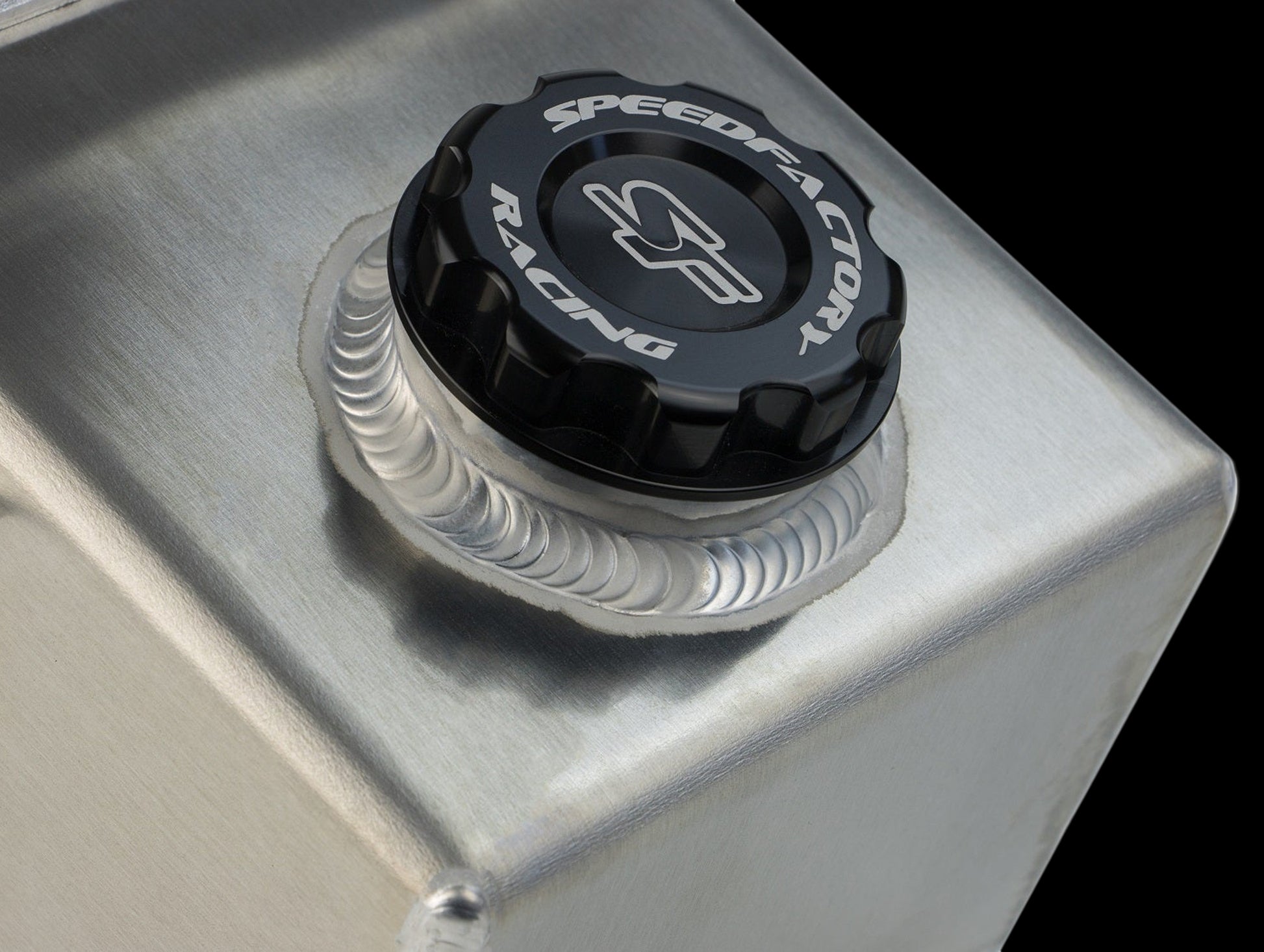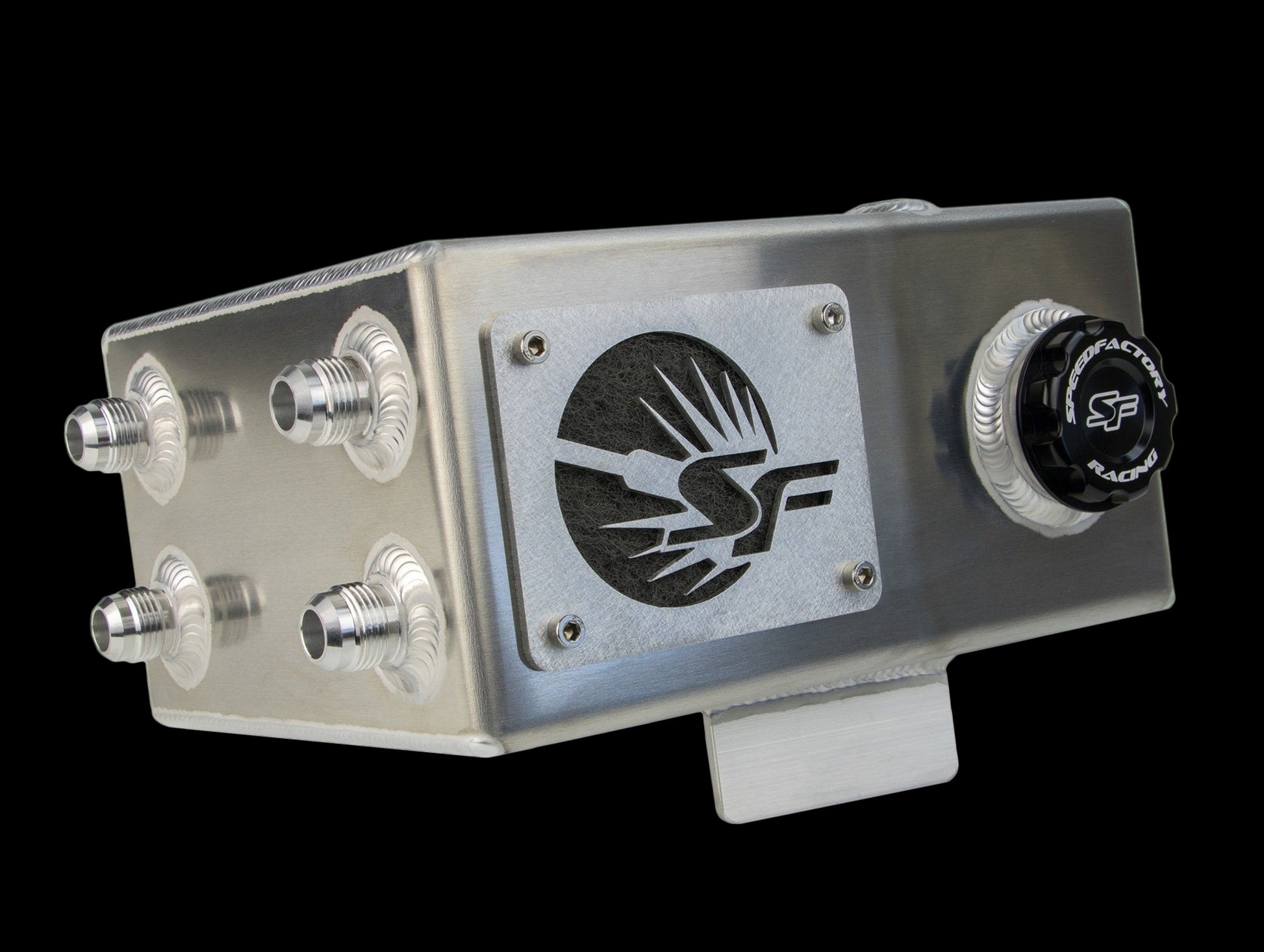 The SpeedFactory Racing Right Hand Drive Angled Oil Catch Can with built in Coolant Overflow Tank is specifically designed for forced induction and heavily modified naturally aspirated engines. This breather setup is engineered to provide the sufficient crankcase ventilation your high performance engine needs, and also condenses crankcase blow-by oil and moisture correctly.The factory PCV system is replaced and all oil vapors are vented to the atmosphere through the laser cut logo. The integrated coolant overflow tank saves precious engine bay space and replaces the unsightly factory plastic unit.