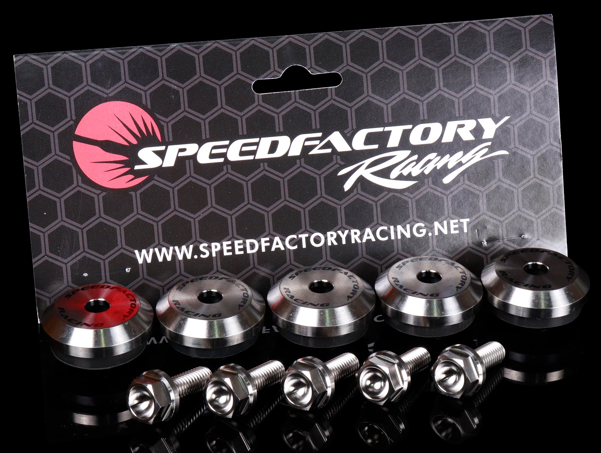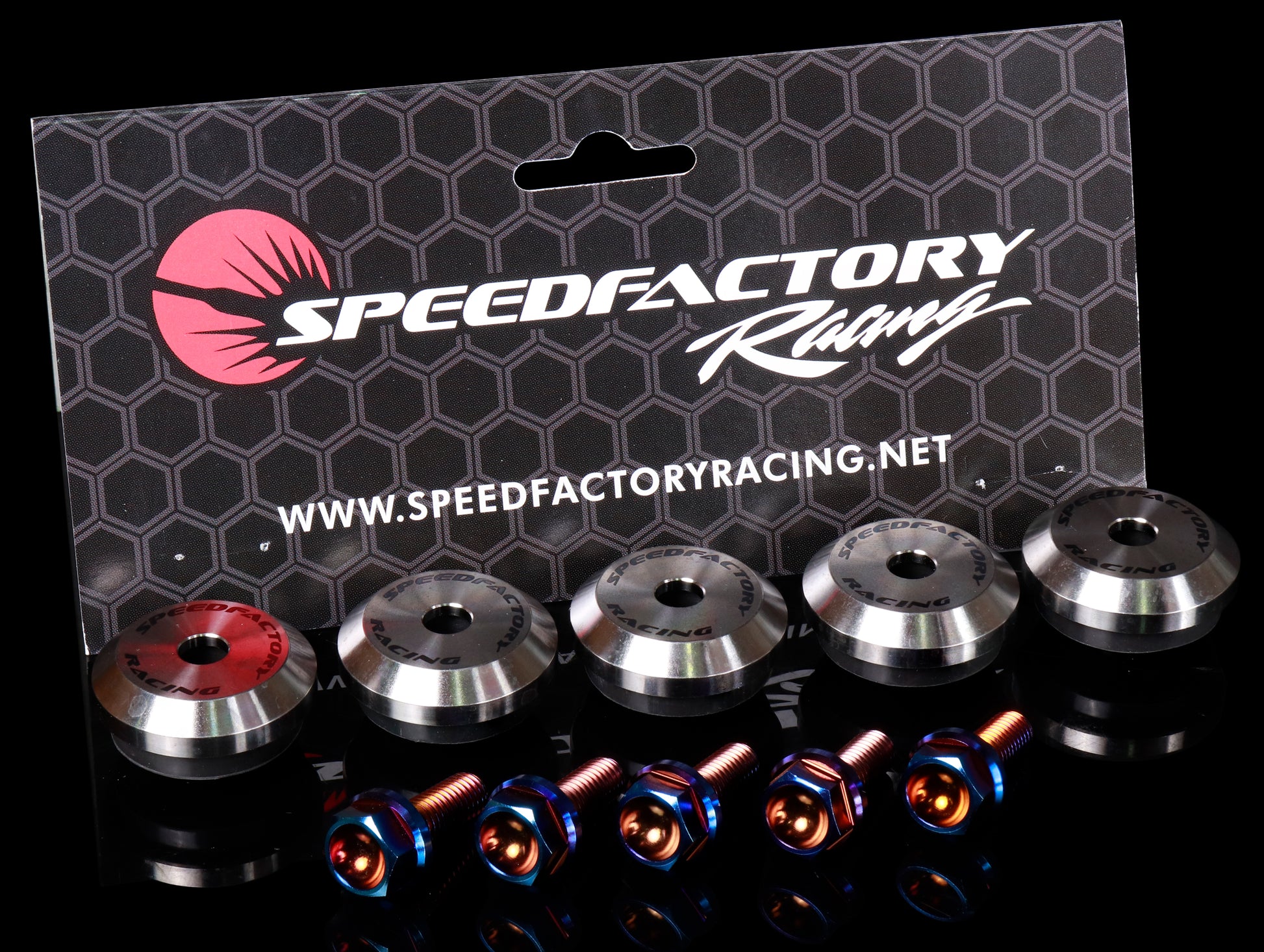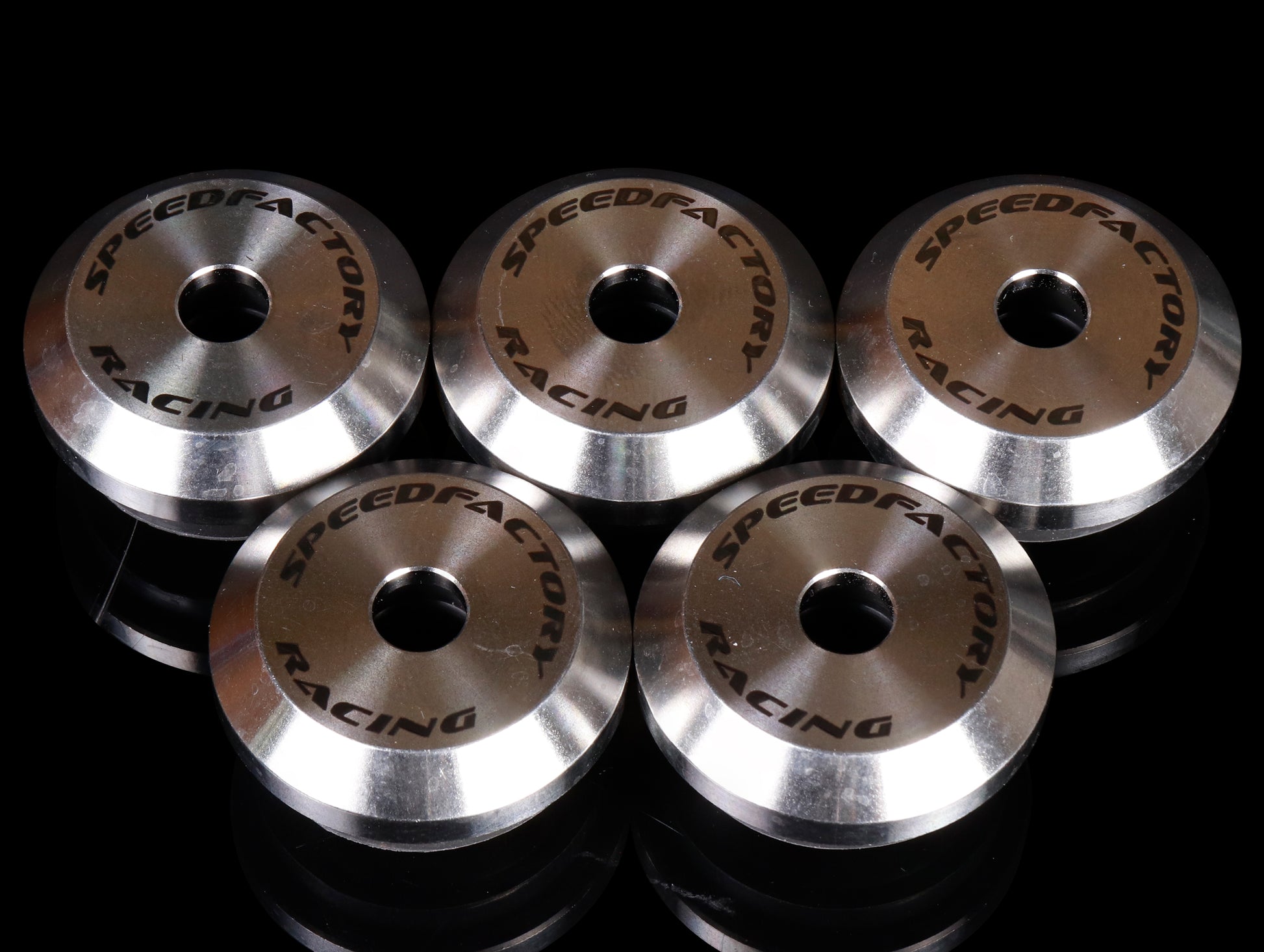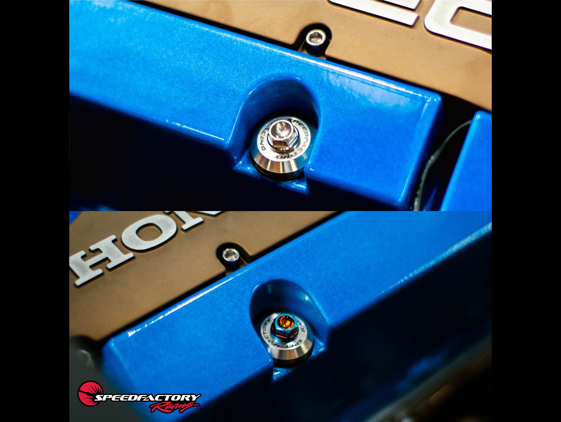 SpeedFactory Racing’s Titanium Valve Cover Hardware Kit adds a unique finishing touch to any engine bay. These kits are available for Honda F-Series engines in Raw and Burnt finishes, and each titanium washer is precision laser-etched with our signature logo.